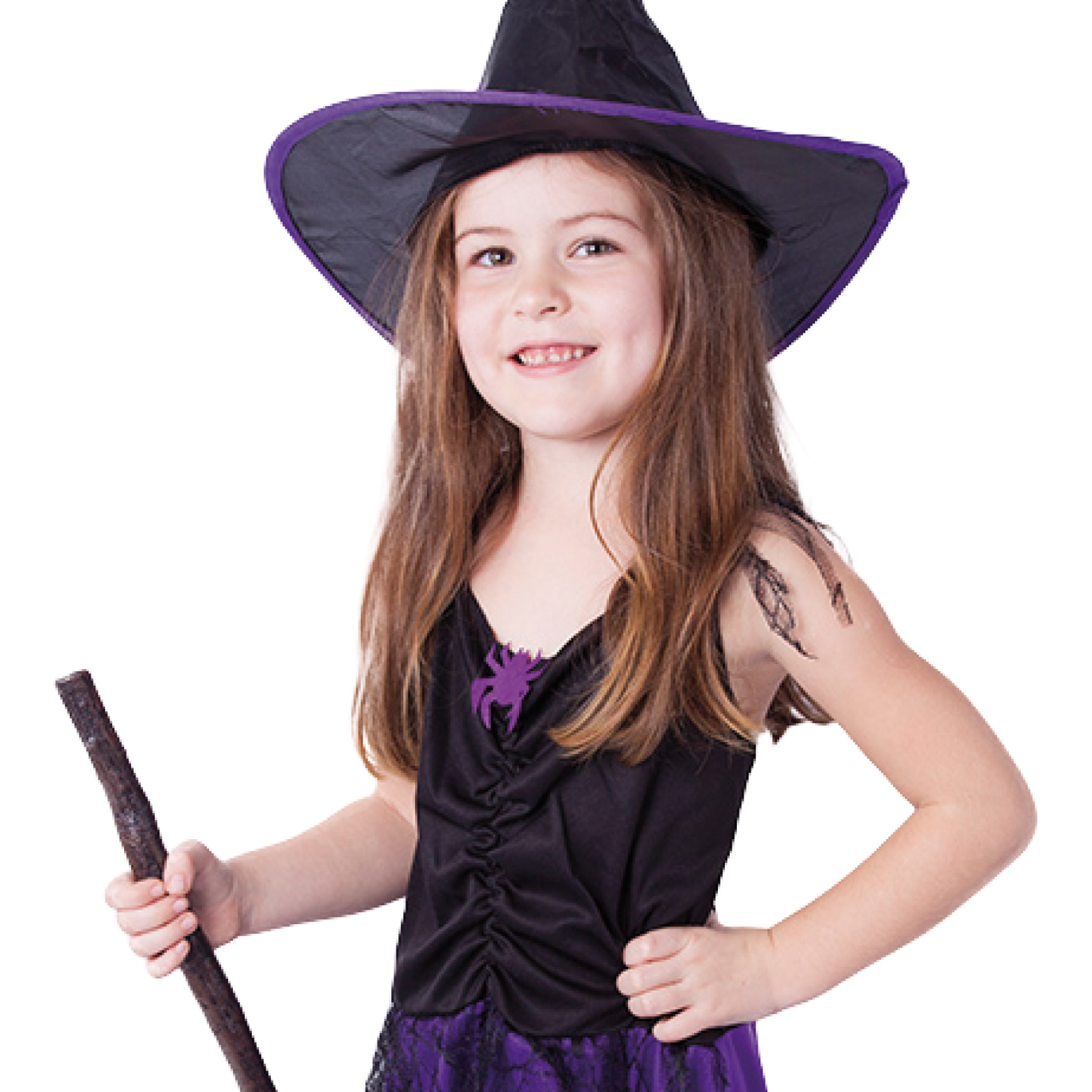 Karnevalový kostým pro malé čarodějnice! Kostým černo-fialové barvy ve velikosti M je určen pro holčičky ve věkovém rozmezí 6-8 let. Šaty jsou dekorovány barevnými halloweenskými motivy. Součástí kostýmu je perfektně sladěný čarodějnický klobouk. S tímto úchvatným kostýmem se zaručeně staneš hvězdou karnevalu i Halloweenu! Nejen letos je