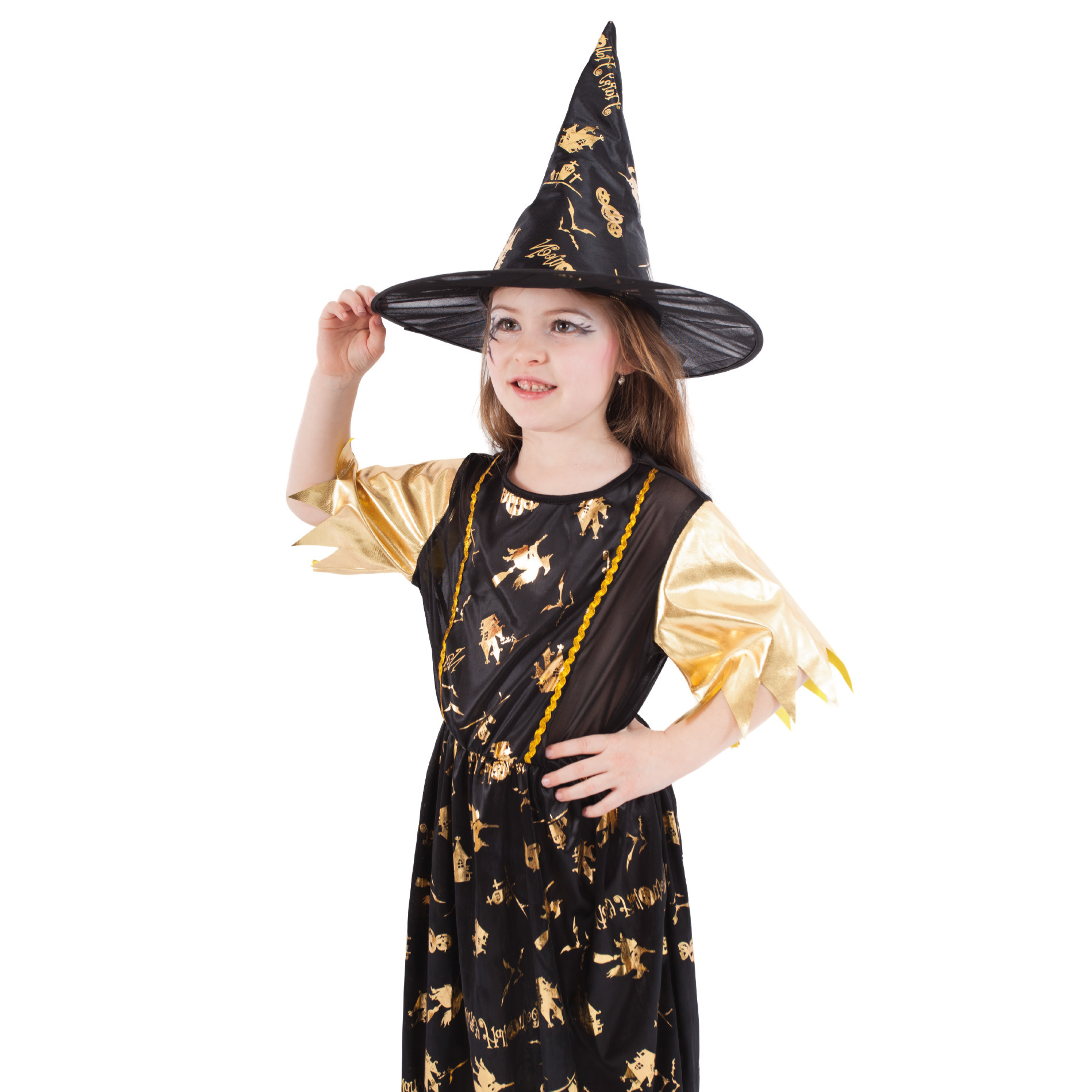 Halloweenský kostým pro malé čarodějnice! Kostým černo-zlaté barvy ve velikosti S je určen pro holčičky ve věkovém rozmezí 3-6 let (105-116 cm). Šaty jsou dekorovány zlatými halloweenskými motivy. Součástí kostýmu je perfektně sladěný čarodějnický klobouk. S tímto úchvatným kostýmem se zaručeně staneš hvězdou karnevalu i Halloweenu! Nejen letos je potřeba myslet EKO-nomicky i EKO-logicky! EKO-balení je vhodné zejména pro e-shopy kde zákazník nakupuje dle fotografie a není třeba velkého balení s věšákem. EKO-logicky – na balení bylo použito méně plastu a dalších materiálů. Jedná se o malý transparentní obal s fotografií. EKO-nomicky –EKO-obal zabere jen polovinu místa – šetřete skladová místa s námi!