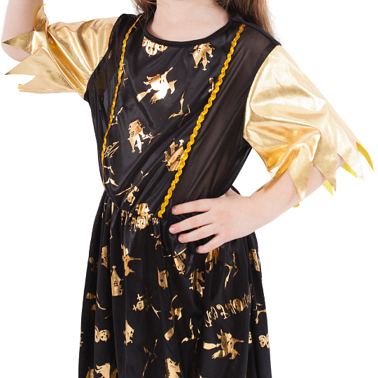 Halloweenský kostým pro malé čarodějnice! Kostým černo-zlaté barvy ve velikosti M je určen pro holčičky ve věkovém rozmezí 6-8 let (117-128 cm). Šaty jsou se dekorovány zlatými halloweenskými motivy. Součástí kostýmu je perfektně sladěný čarodějnický klobouk. S tímto úchvatným kostýmem se zaručeně staneš hvězdou karnevalu i Halloweenu!