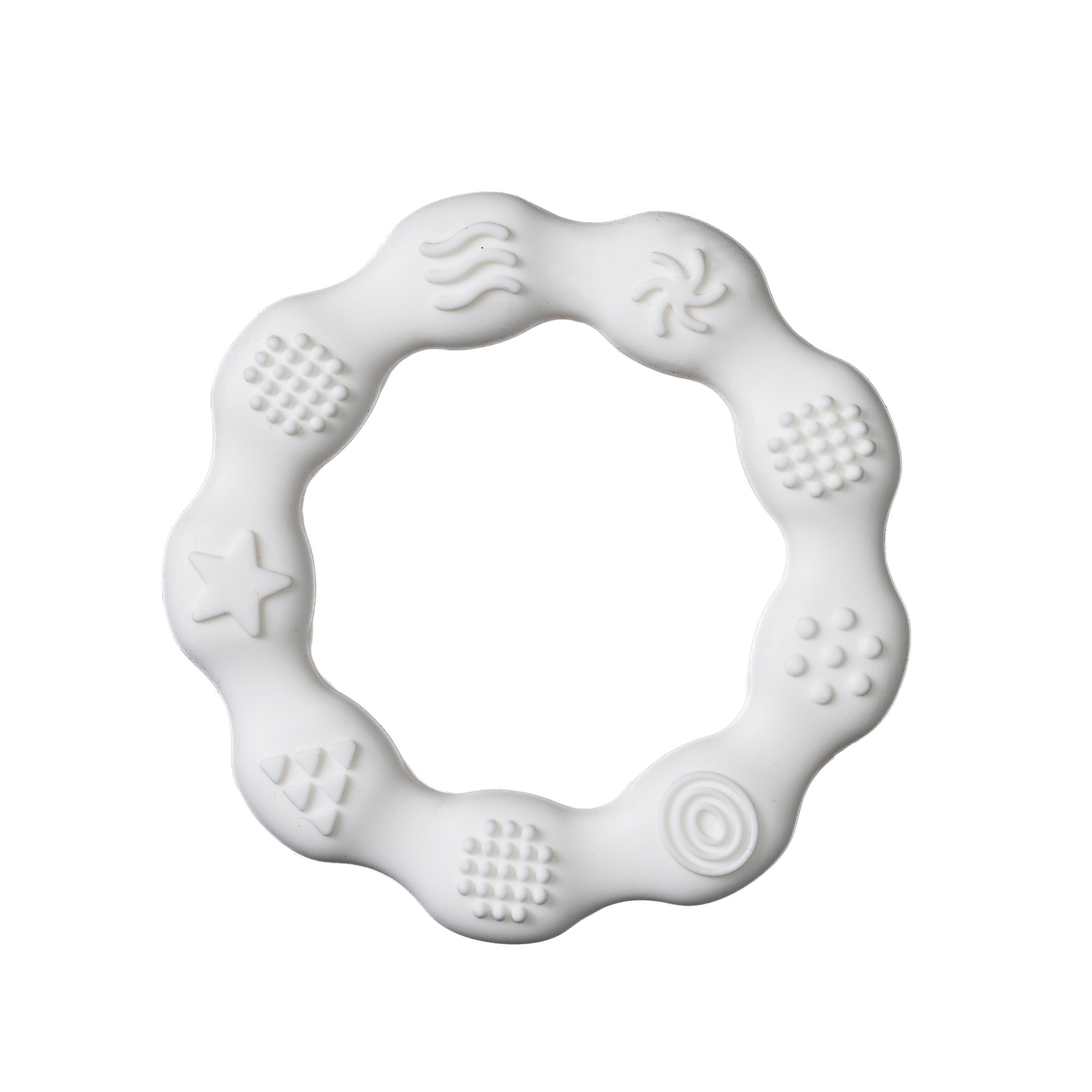 Kousátko v bílé barvě je tvarově koncipováno tak, aby jej dítě snadno uchopilo. Na kolečku jsou vystouplé tvary, které mohou dobře působit např.při prořezávání zoubků.