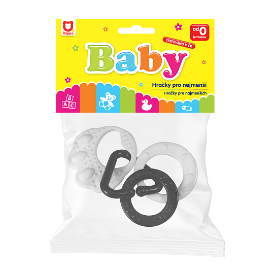 Kousátko v černobílé kombinaci dokonale stimuluje smysl zraku u dítěte, které dosud nerozlišuje barvy. Na tlapičce jsou zavěšené plastové tvary v různých provedeních, ať už ve tvaru kolečka, srdíčka, zvonečku apod.