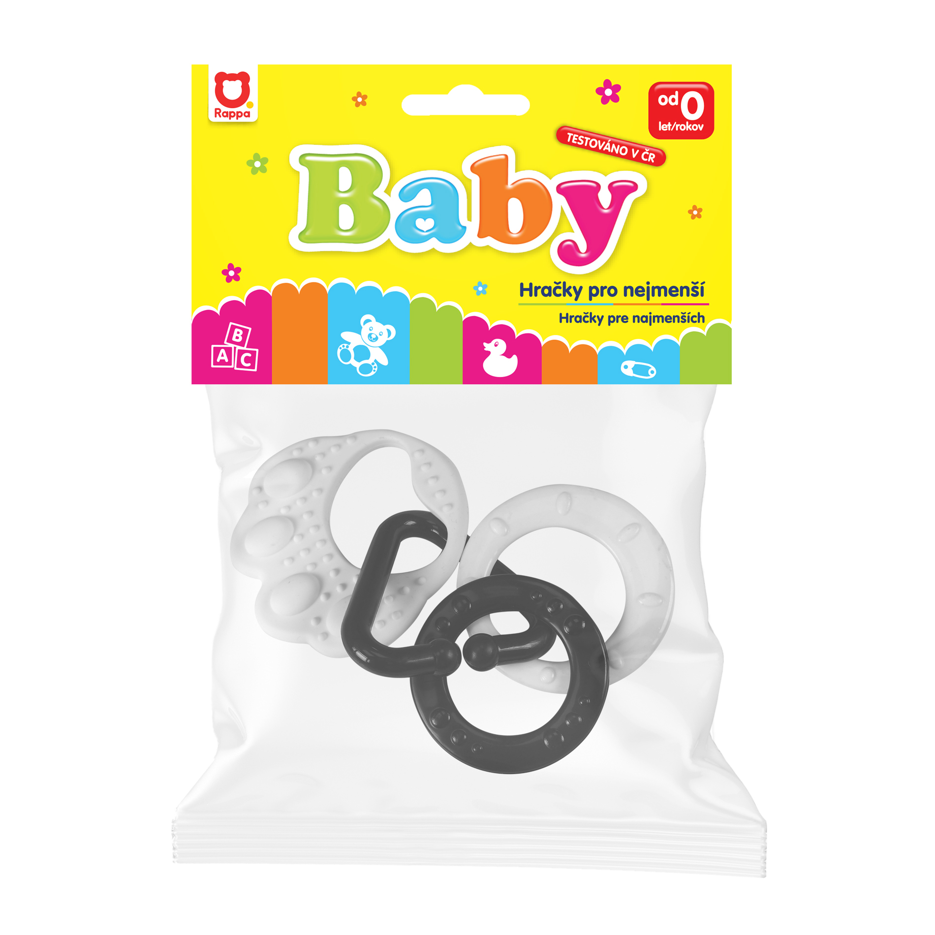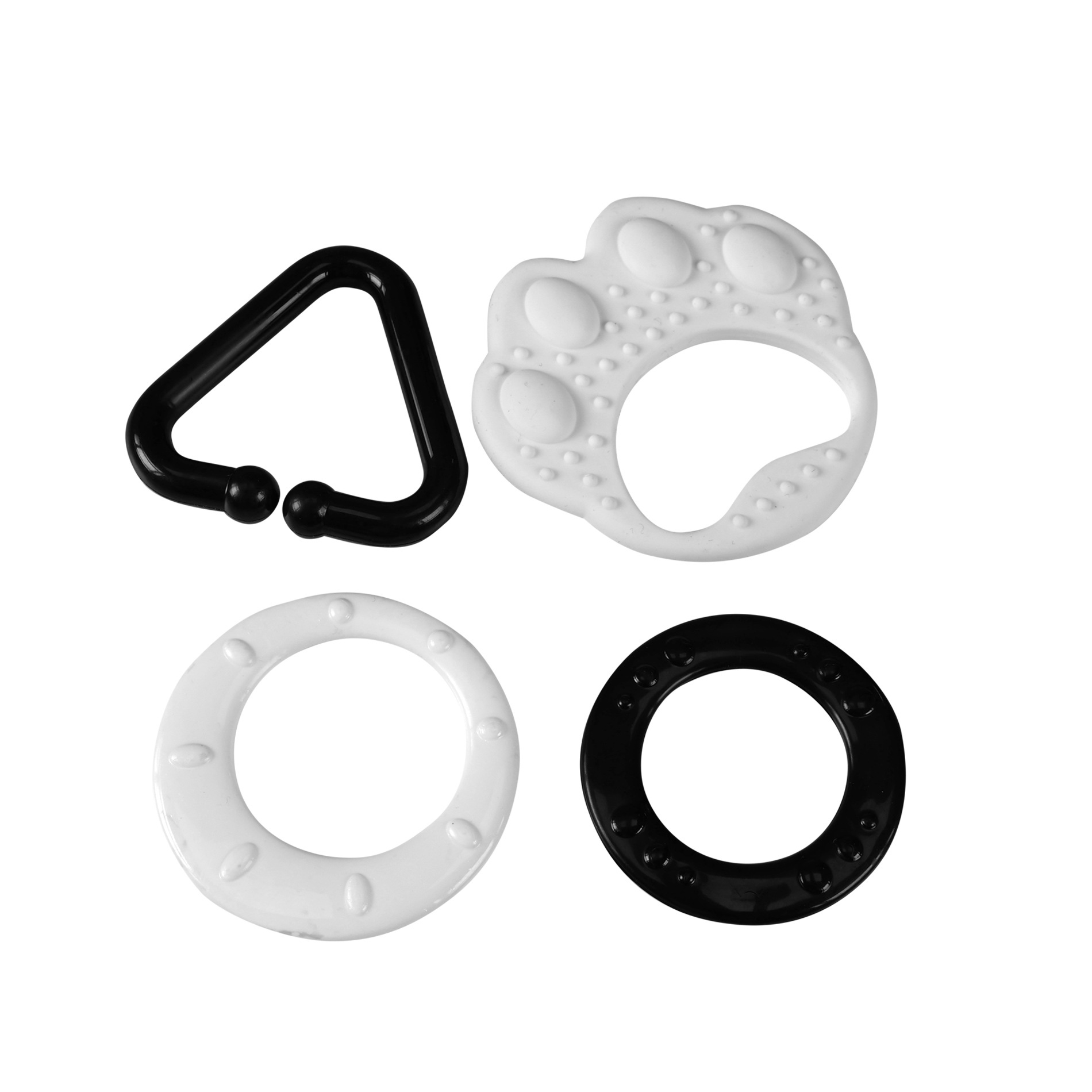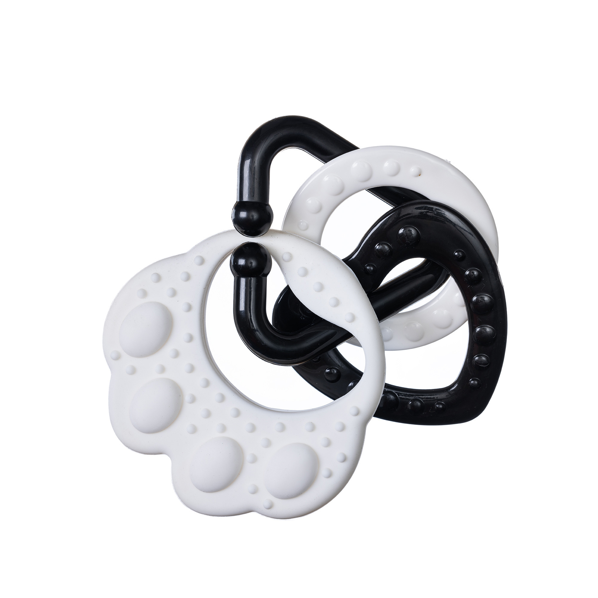 Kousátko v černobílé kombinaci dokonale stimuluje smysl zraku u dítěte, které dosud nerozlišuje barvy. Na tlapičce jsou zavěšené plastové tvary v různých provedeních, ať už ve tvaru kolečka, srdíčka, zvonečku apod.