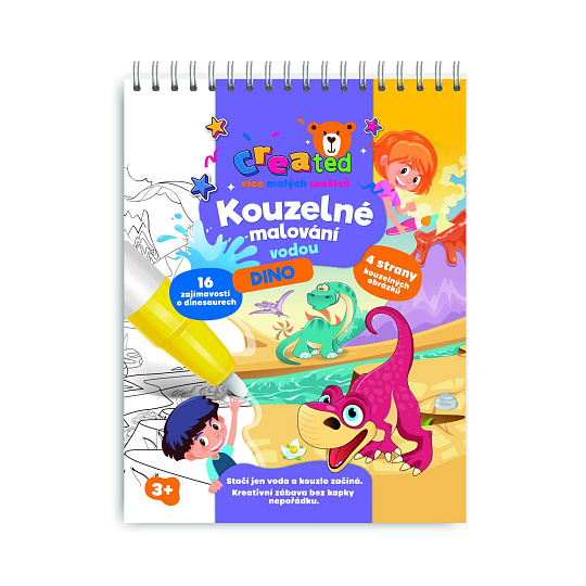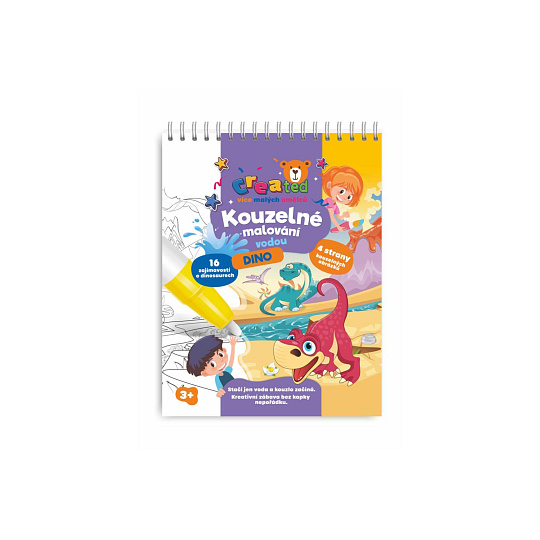 Objevte zábavný způsob malování, který nevyžaduje žádné barvy ani nepořádek. Tato kouzelná knížka created – Kouzelné malování vodou s motivem dinosaurů potěší všechny malé umělce a milovníky prehistorie. Jak to funguje? Stačí naplnit přiložené pero vodou a přejíždět jím po obrázku – barvy se začnou magicky objevovat. Po zaschnutí obrázek opět zbělá a dítě může malovat znovu a znovu. Bez nepořádku, bez barev, bez stresu – jen čistá radost z tvoření. Skvělá volba na cesty, do auta nebo jako kreativní dárek. Obsahuje také 16 zajímavostí o dinosaurech.