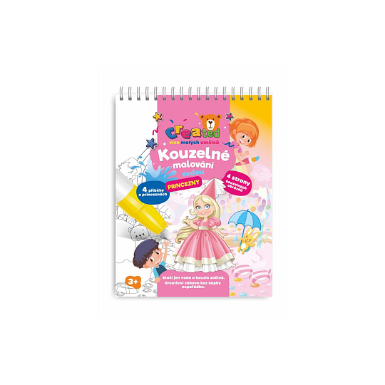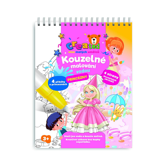 Stačí jen voda a kouzlo začíná! S tímto kouzelným blokem se děti přenesou do pohádkového světa princezen, krásných šatů a zámků. Naplňte přiloženou kouzelnou tužku vodou a sledujte, jak se obrázky samy vybarvují – bez kapky nepořádku. Po vyschnutí barvy zmizí a malování může začít znovu. Obsahuje 4 příběhy o princeznách, 4 kouzelné obrázky k vybarvování vodou a 1 kouzelnou vodní tužku.
