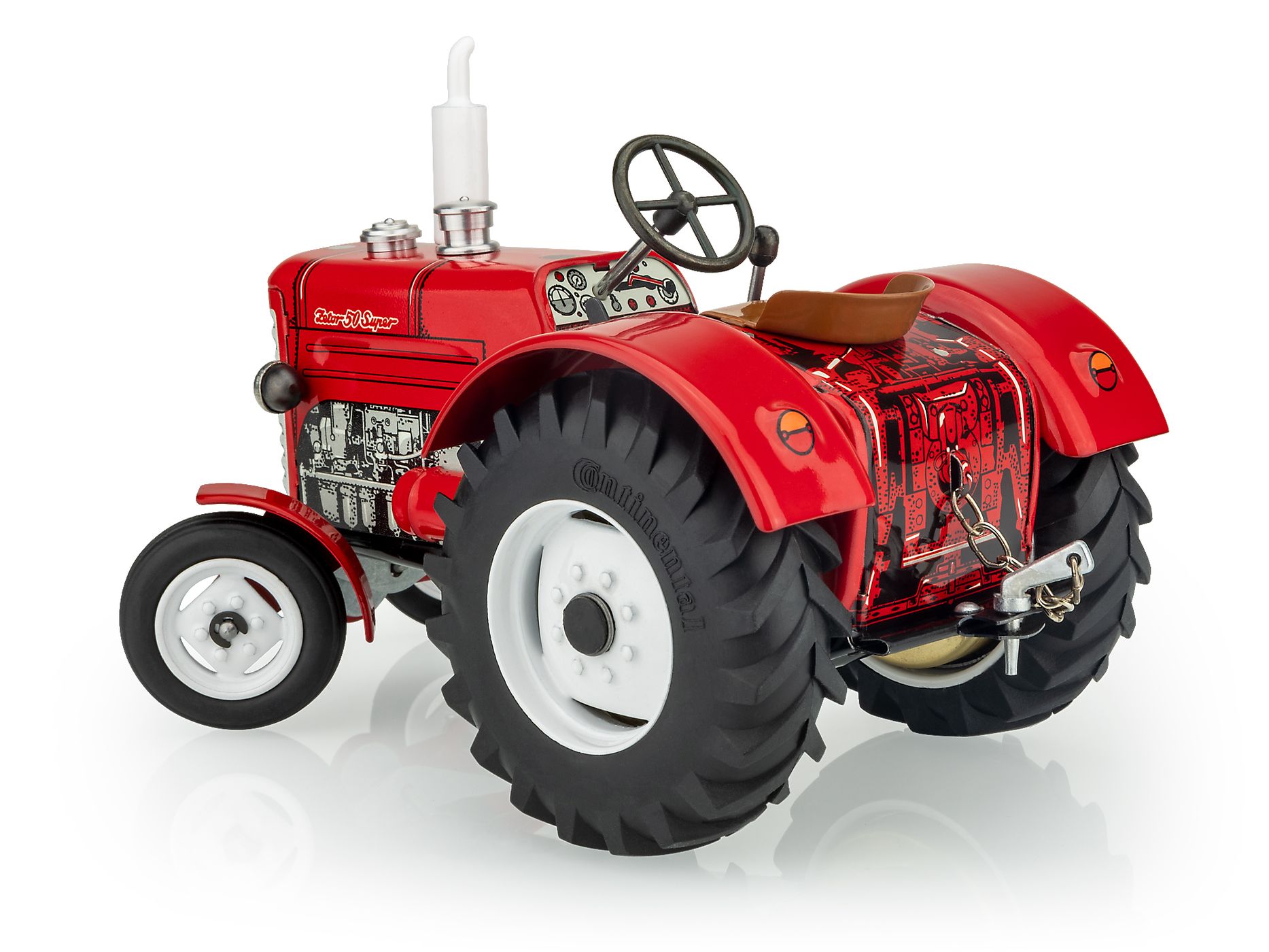 Traktor Zetor 50 Super. Pohon plechové hračky zajišťuje mechanický pérový strojek natahovaný klíčkem. Traktor má čtyřrychlostní převodovku. Disponuje třemi rozdílnými rychlostmi vpřed, zpátečkou a neutrálem. Je rovněž vybaven ruční brzdou. Přední náprava je řiditelná volantem. Měřítko 1:25. Rozměry balení 16 x 11 x 9 cm. Vhodné pro děti od 3 let.