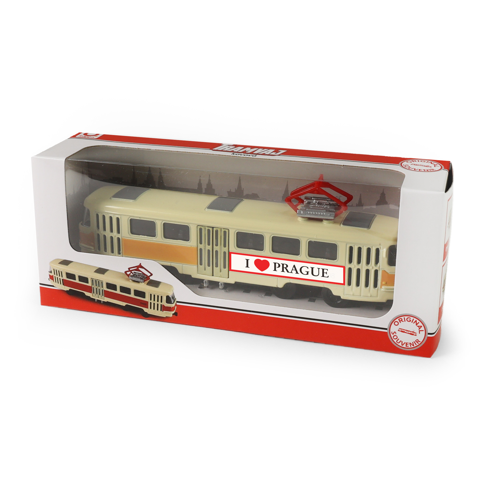 Originální kovová retro tramvaj T3 s nápisem PRAGUE a měřítkem 1:87, která jezdí na zpětný chod. Délka tramvaje je cca 16 cm a prostřední dveře je možné manuálně otevřít. Jedná se o nejpočetněji vyráběný tramvajový vůz na světě. Takže ty, jako správný fanda těchto sběratelských kousků ji rozhodně musíš mít!