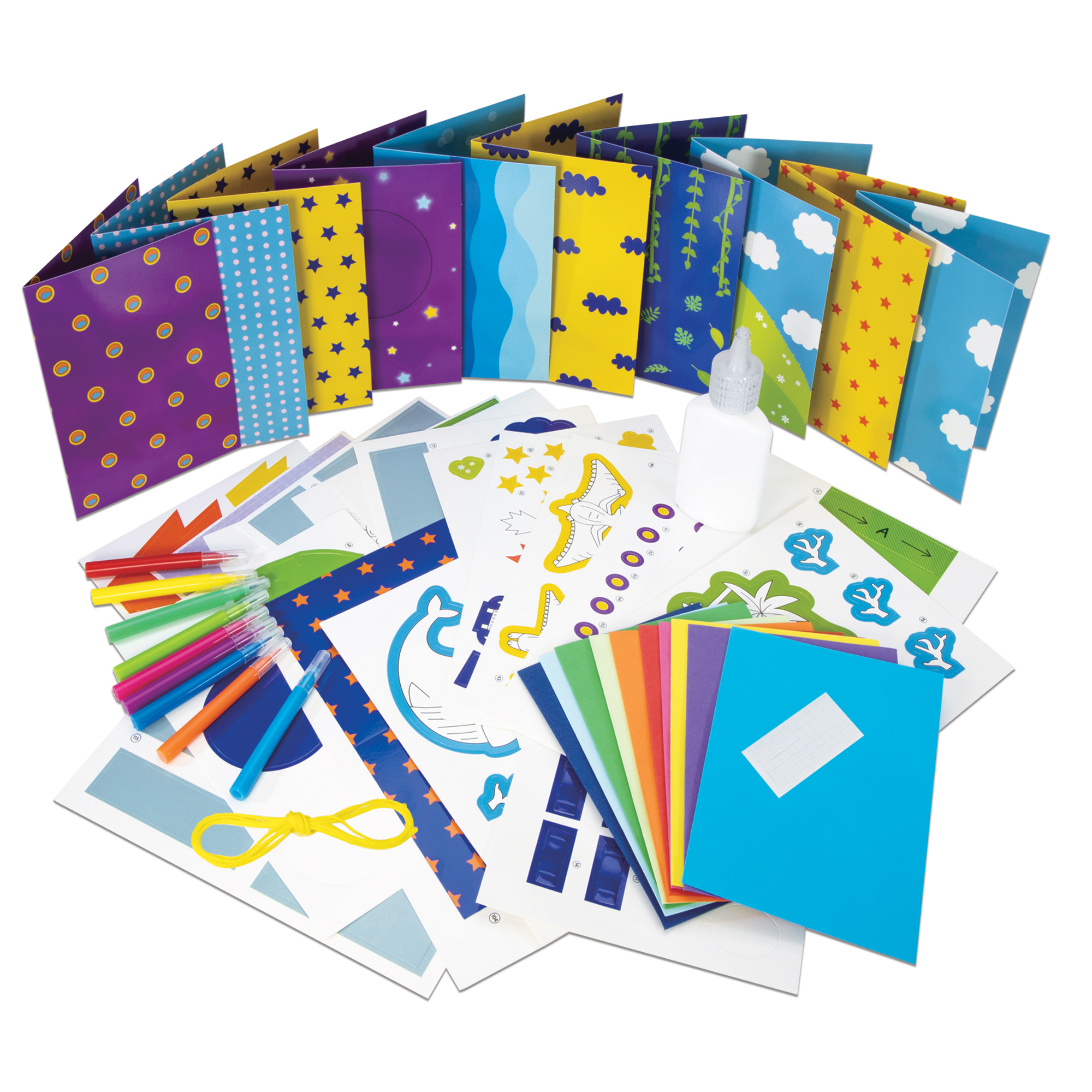 Sady obsahují 10 předem vykrojených kartiček a barevné fixy, které dětem umožní vytvořit 10 unikátních a kreativních pop-up pohyblivých kartiček.