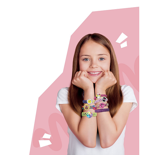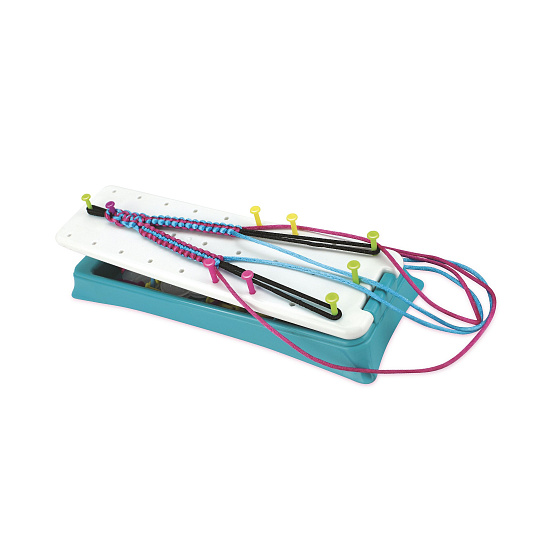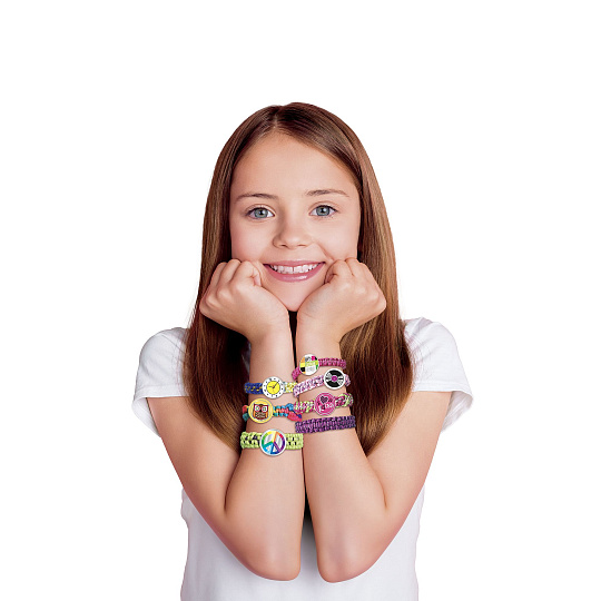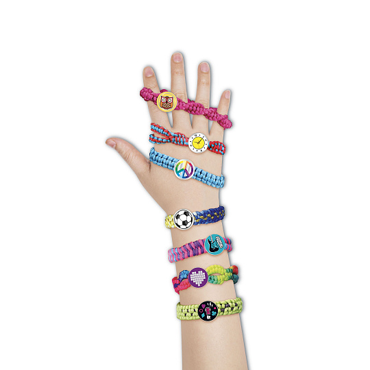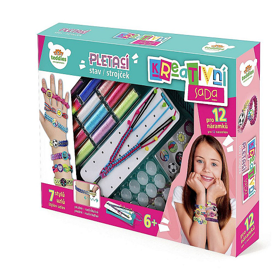 Kreativní sada obsahuje pletací stav, příze, spojovací knoflíčky a samolepky. Děti si mohou uplést 12 náramků a vybrat si mohou ze 7 stylů uzlů. Rozměry balení 38 x 38 x 6 cm Vhodné pro děti od 6 let