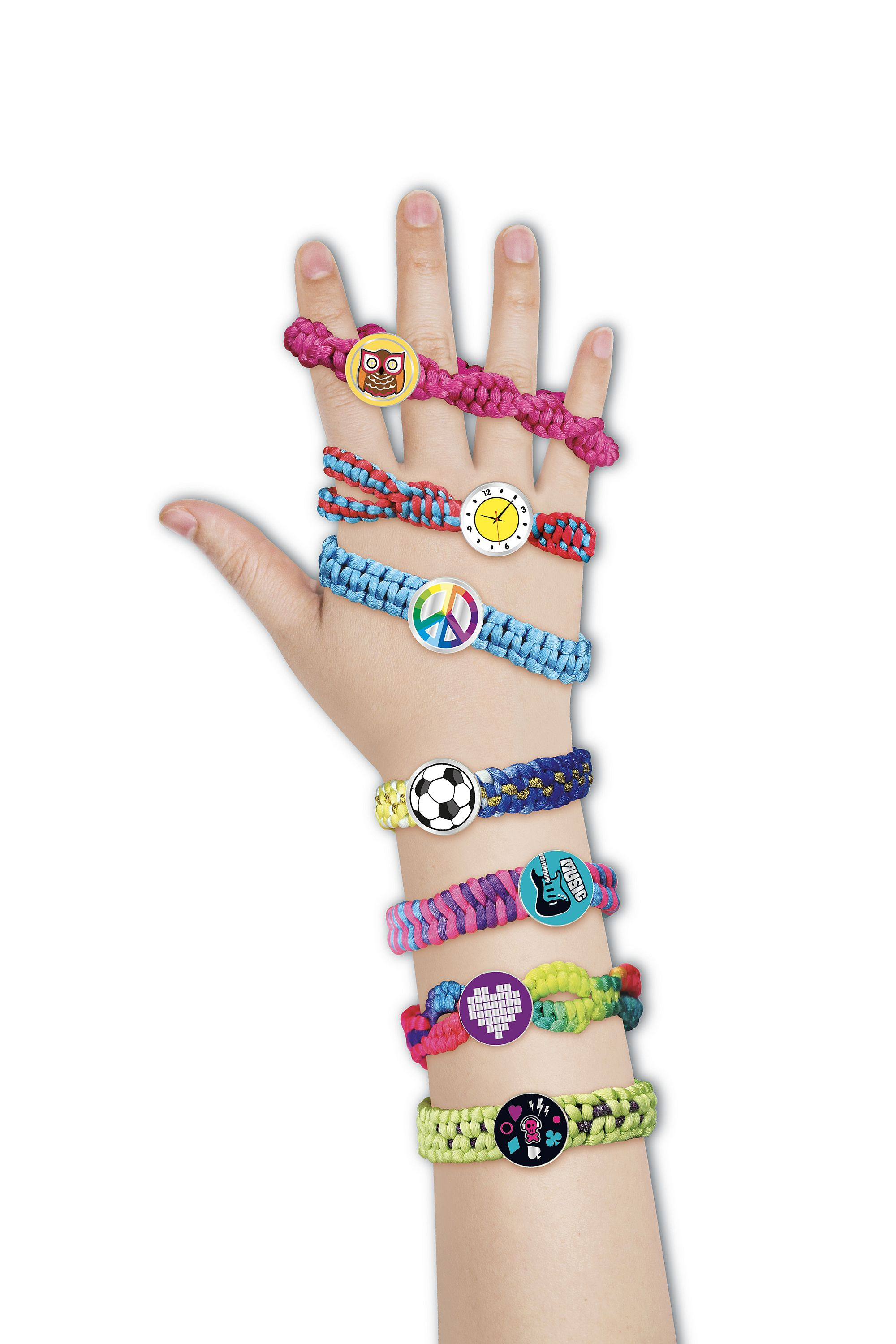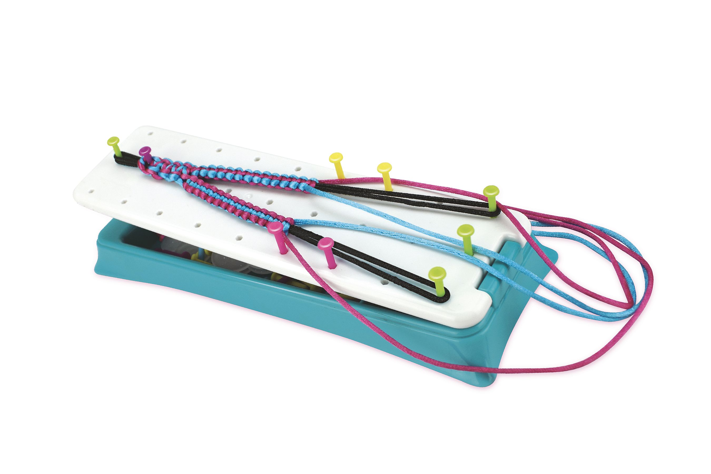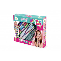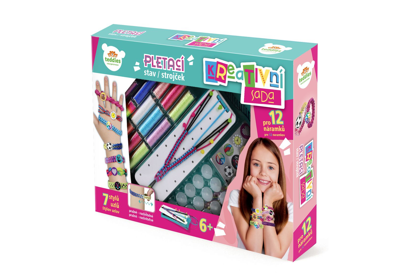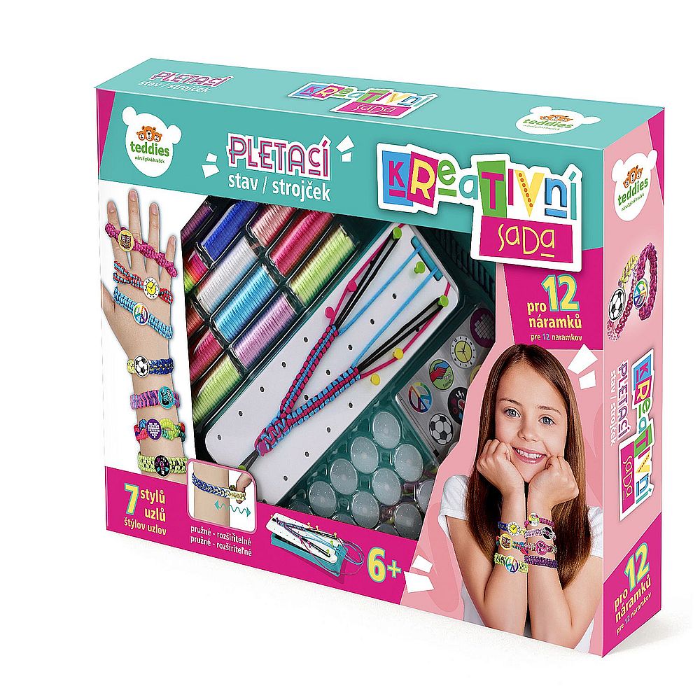 Kreativní sada obsahuje pletací stav, příze, spojovací knoflíčky a samolepky. Děti si mohou uplést 12 náramků a vybrat si mohou ze 7 stylů uzlů. Rozměry balení 38 x 38 x 6 cm Vhodné pro děti od 6 let