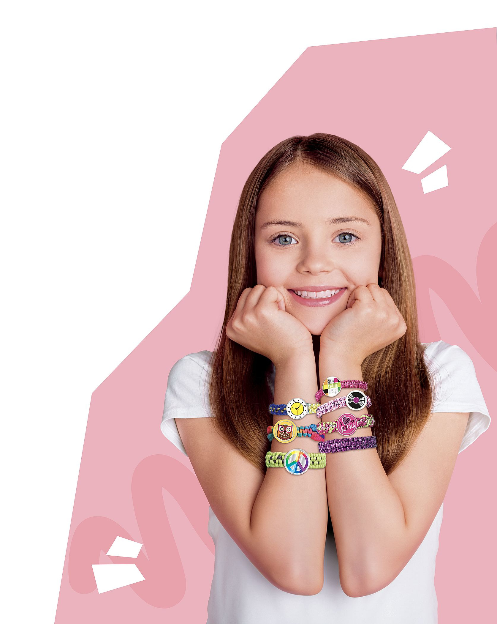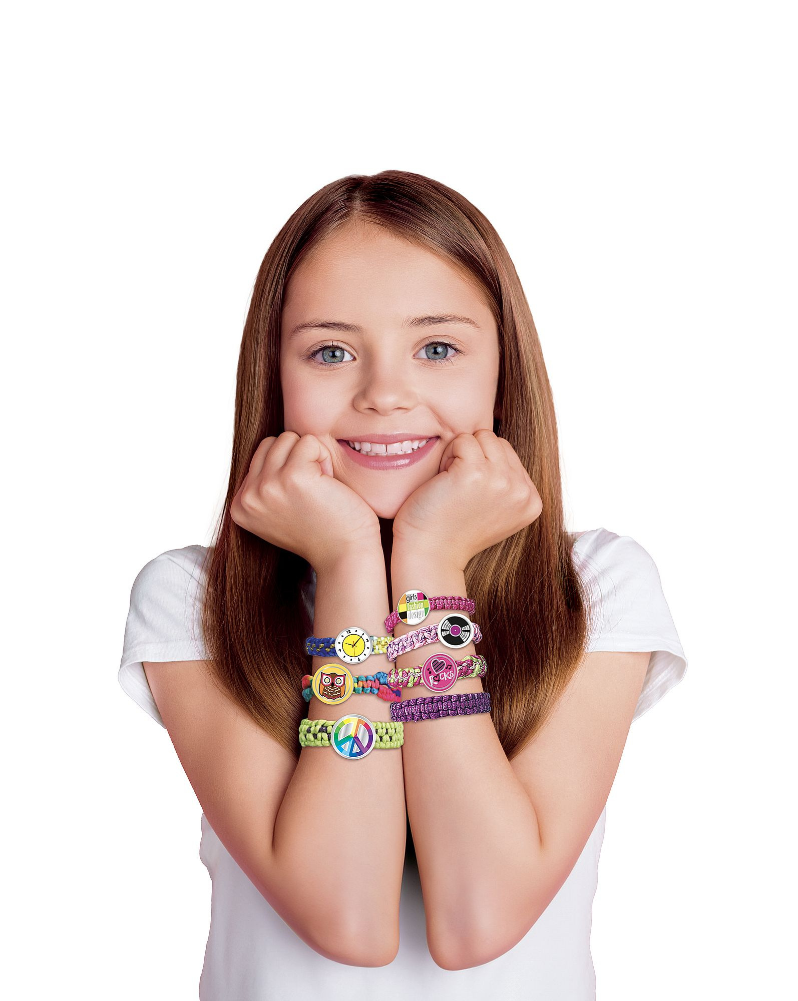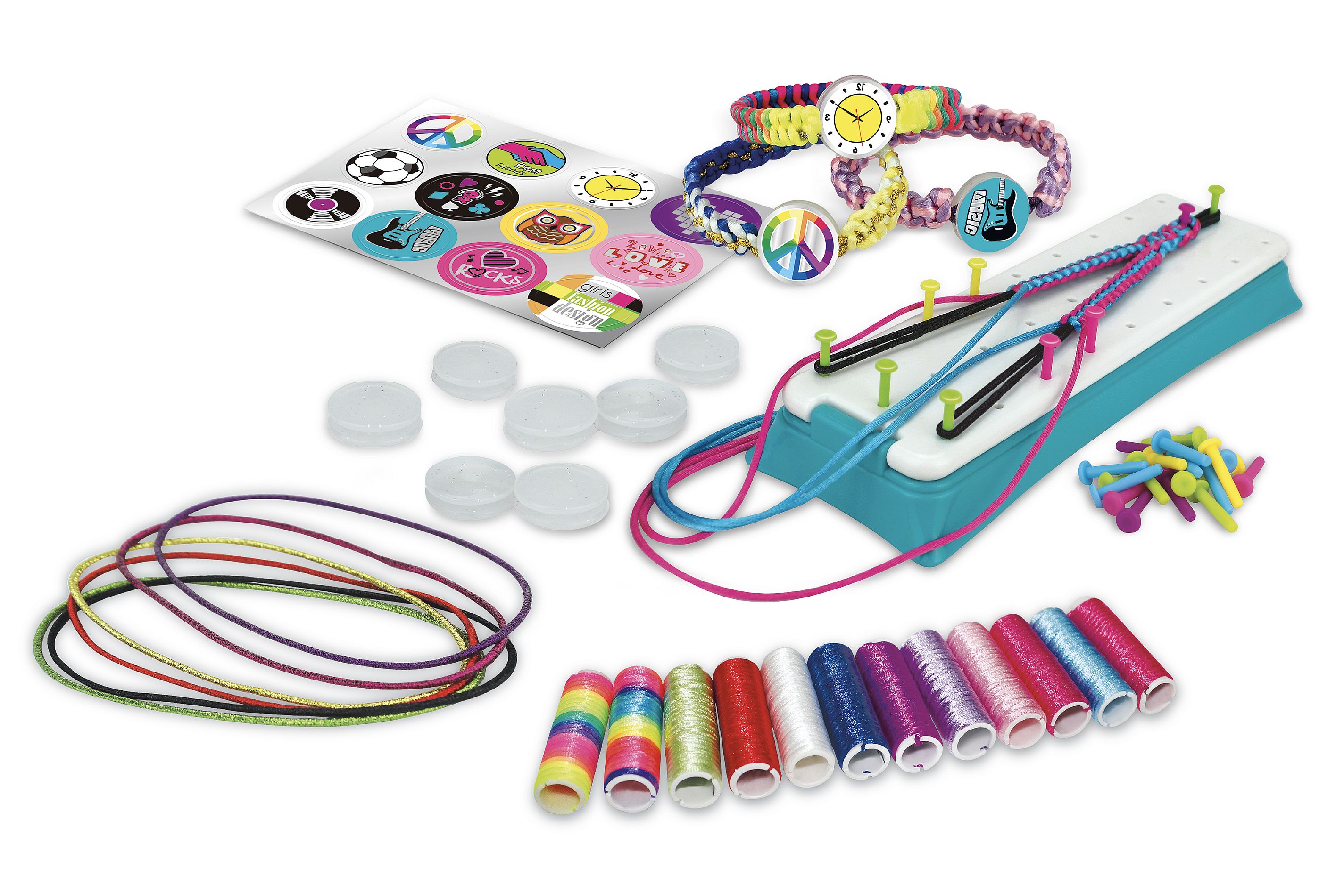 Kreativní sada obsahuje pletací stav, příze, spojovací knoflíčky a samolepky. Děti si mohou uplést 12 náramků a vybrat si mohou ze 7 stylů uzlů. Rozměry balení 38 x 38 x 6 cm Vhodné pro děti od 6 let