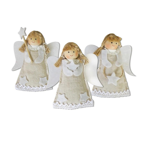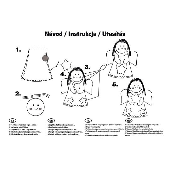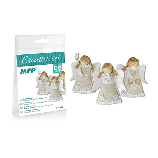 Kreativní set - andílek - Děti si procvičí svoje prstíky a rozvinou kreativní myšlení. Jedno balení obsahuje tři andílky. Každý kousek bude originální a jedinečný. Můžete si s nimi jen tak vyzdobit byt, nebo si s ním mohou děti hrát.BALENÍ OBSAHUJE:- 3 x filc ve tvaru andílků- stuhu- plstěnou výplň- nit- návod NÁVOD:1. Do plstěného těla vložte výplň a sešíjte.2. Svažte vlasy bílou šňůrkou.3. Nalepte vlasy na hlavu a tu pak na tělo.4. Nalepte hvězdu na hůlku a pak přilepte k tělu.5. Nalepte křídla, ruce, límce a hvězdy k tělu.VAROVÁNÍ:Používejte pod dozorem dospělé osoby, obal odstraňte z dosahu dětí, není vhodné pro děti do 7 let, obsahuje malé části, nebezpečí spolknutí a udušení.Dodáváme v papírové krabičce se závěsem.Uvedená cena je za 1 balení.