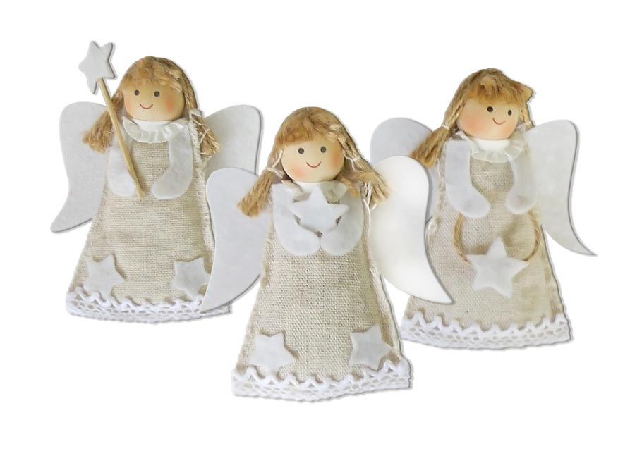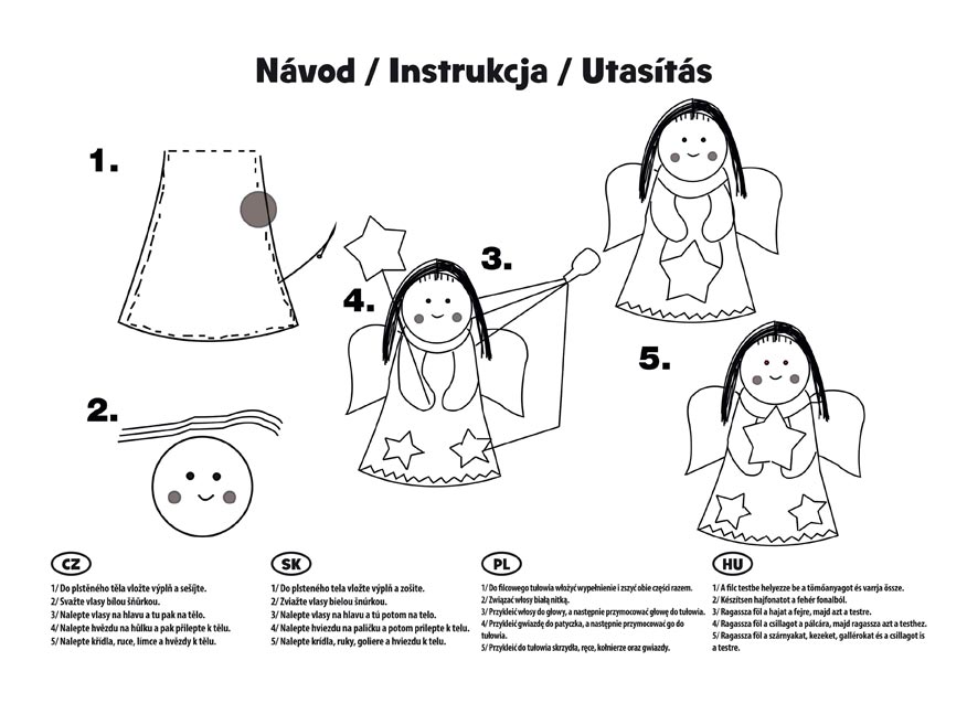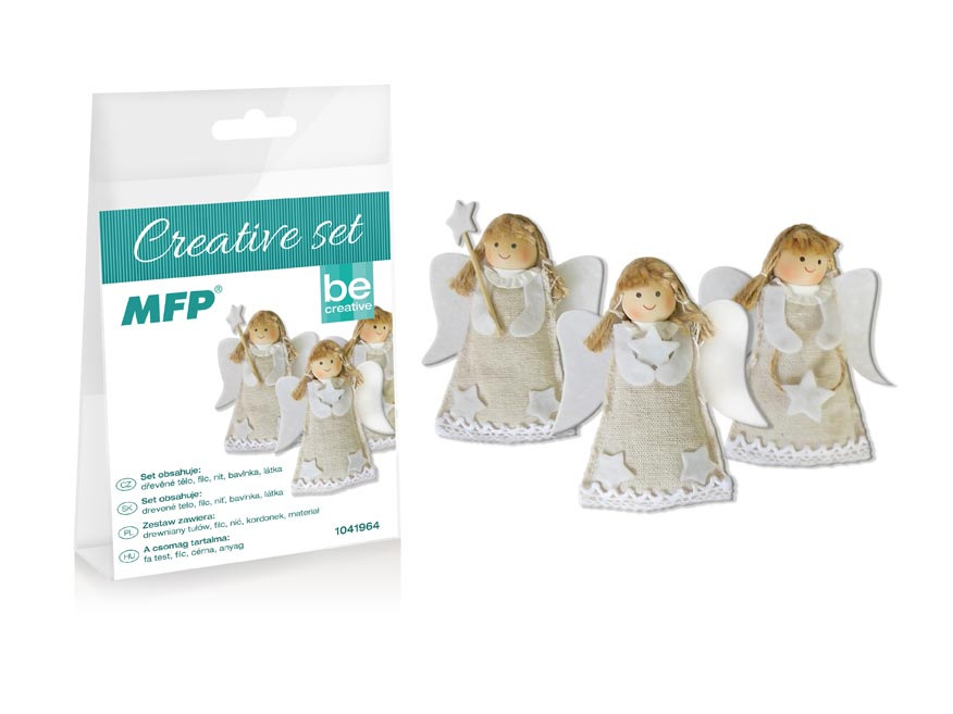 Kreativní set - andílek - Děti si procvičí svoje prstíky a rozvinou kreativní myšlení. Jedno balení obsahuje tři andílky. Každý kousek bude originální a jedinečný. Můžete si s nimi jen tak vyzdobit byt, nebo si s ním mohou děti hrát.BALENÍ OBSAHUJE:- 3 x filc ve tvaru andílků- stuhu- plstěnou výplň- nit- návod NÁVOD:1. Do plstěného těla vložte výplň a sešíjte.2. Svažte vlasy bílou šňůrkou.3. Nalepte vlasy na hlavu a tu pak na tělo.4. Nalepte hvězdu na hůlku a pak přilepte k tělu.5. Nalepte křídla, ruce, límce a hvězdy k tělu.VAROVÁNÍ:Používejte pod dozorem dospělé osoby, obal odstraňte z dosahu dětí, není vhodné pro děti do 7 let, obsahuje malé části, nebezpečí spolknutí a udušení.Dodáváme v papírové krabičce se závěsem.Uvedená cena je za 1 balení.