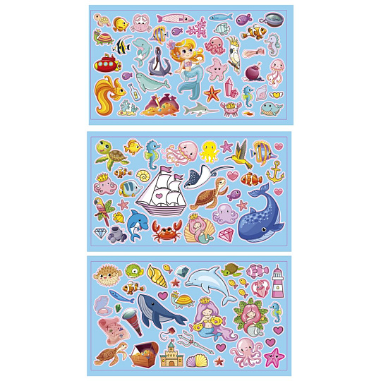 Kreativní set obsahující 2 scenérie/prostředí, kam můžete nalepit přes 100 přiložených samolepek a vytvořit si tak svůj originální obrázek. Samolepky se dají lehce odlepit a nalepit jinam. Samolepky lze lepit i na sklo/okna. 29x21 cm