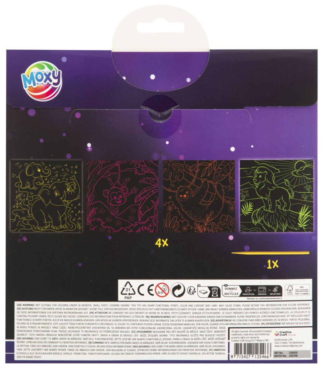 Kreativní set obsahuje 4 kusy vyškrabávacích obrázků, které září ve tmě a vyškrabávací pero velikost obrázku je 19,5x19,5 cm