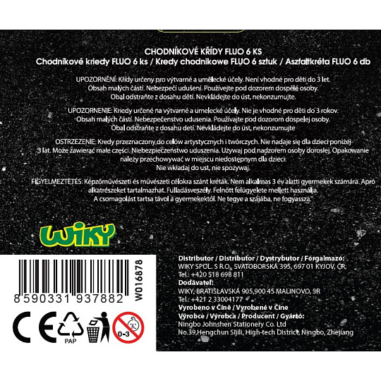 Chodníkové křídy FLUO 6ks. Zářivé barvy - klasický hrot. Barvy: Žlutá, fialová, oranžová, modrá, zelená, růžová.