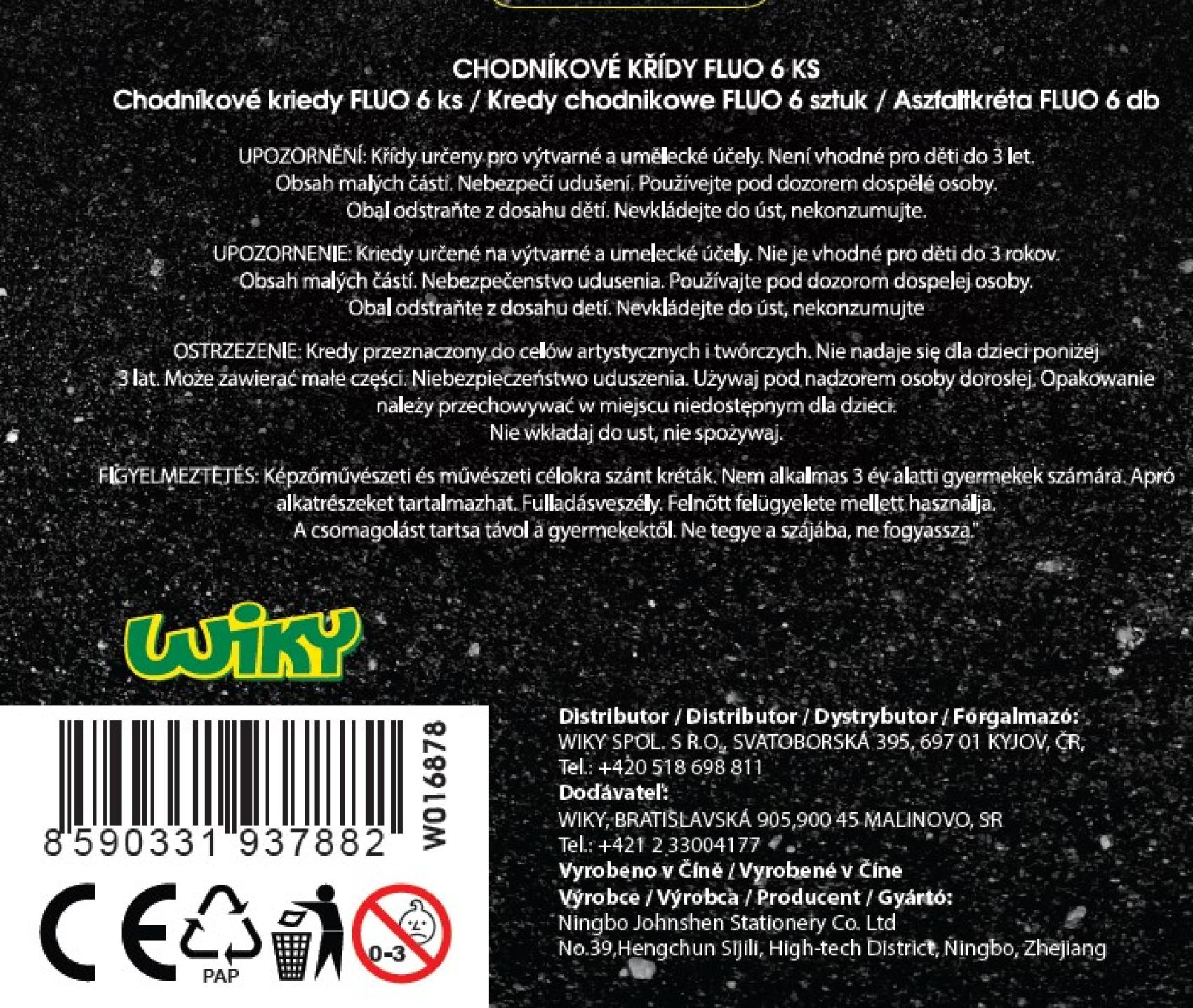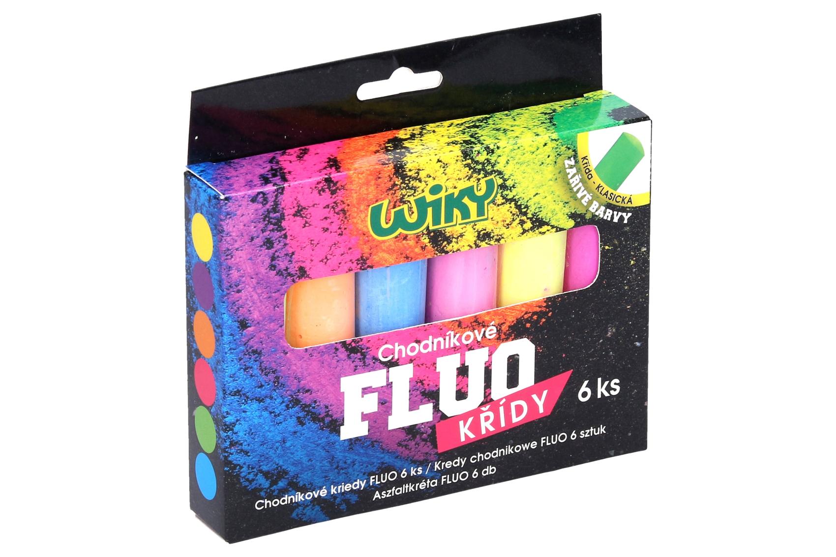 Chodníkové křídy FLUO 6ks. Zářivé barvy - klasický hrot. Barvy: Žlutá, fialová, oranžová, modrá, zelená, růžová.
