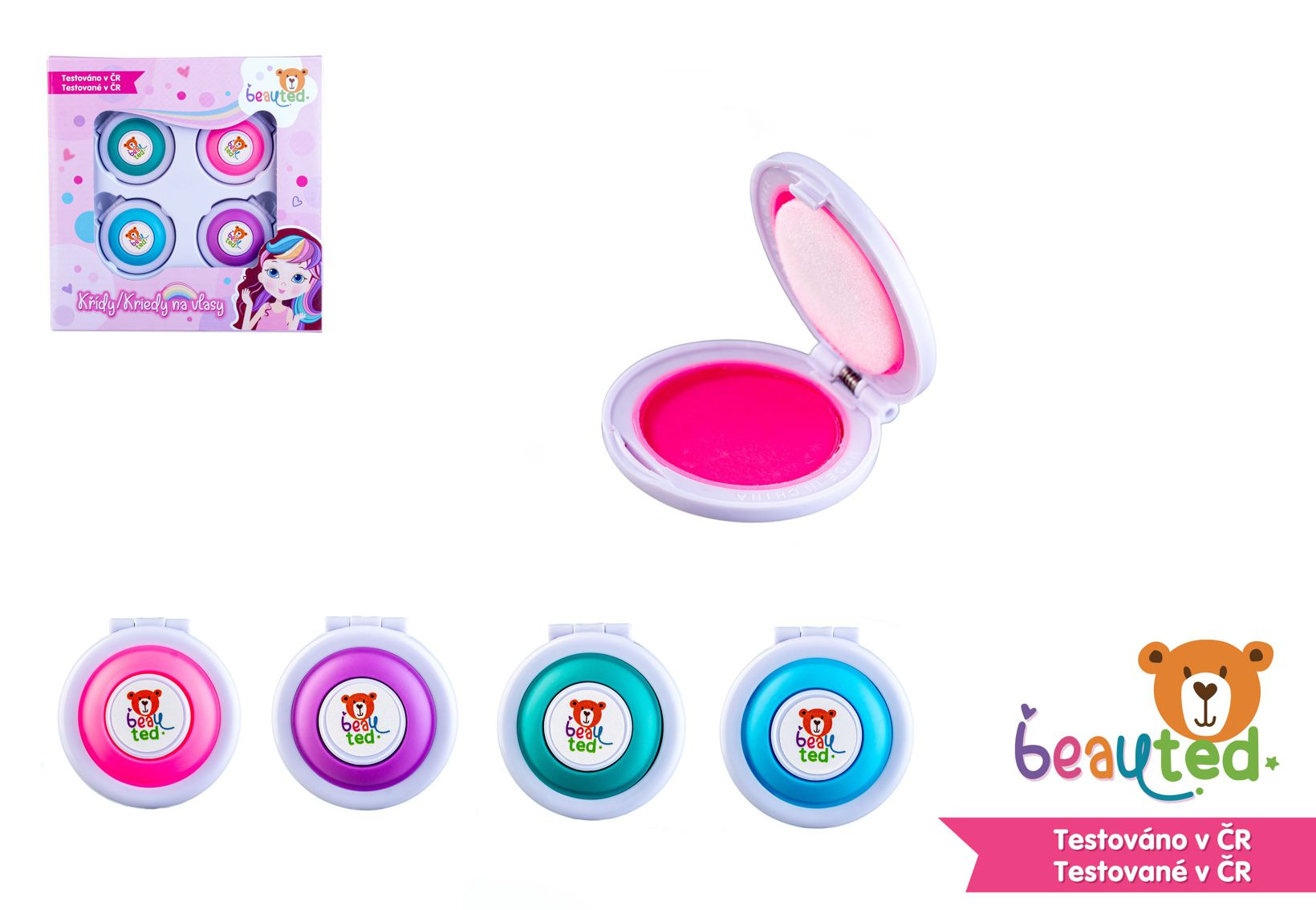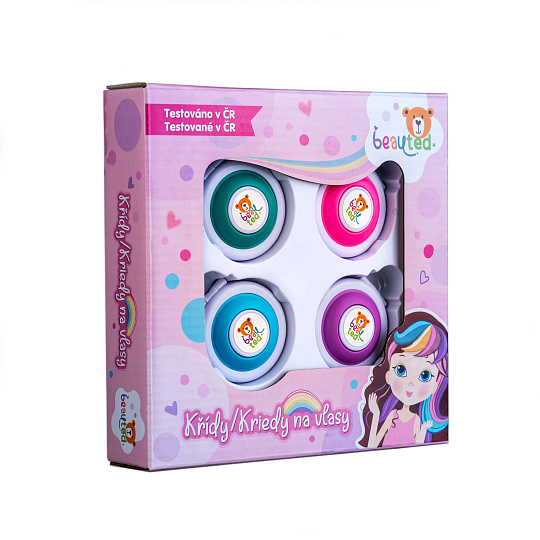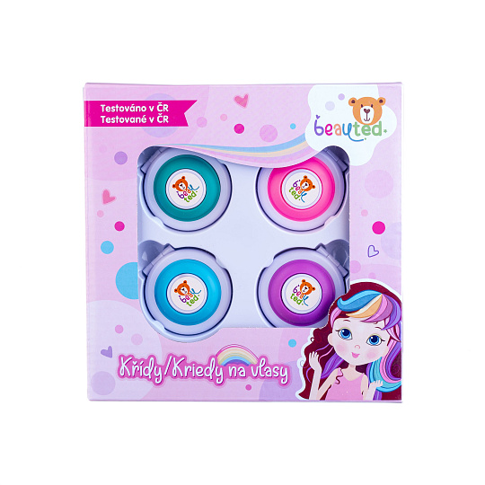 Speciální barevné křídy na vlasy, díky nimž si děti mohou nabarvit vlasy dle vlastní fantazie. Křídy se snadno umyjí šamponem. Vítejte v hravém a bezpečném světě kosmetiky značky beauted. Malé holčičky se začínají seznamovat se světem krásy již od raného dětství a brzy je zajímá vše, co jejich maminky používají. Značka beauted je k objevování kosmetiky jako stvořená. Produkty této řady jsou navrženy tak, aby byly hlavně bezpečné, ale také hravé a inspirativní. Podpoří kreativitu a představivost, umožní rozvíjet a formovat smysl pro estetiku a krásu. Značka beauted je laboratorně testovaná v České republice. Kontrola těžkých kovů je prověřena státním zdravotní ústavem, plastové obaly jsou testovaných v ITC Zlín. Podklady pro evropský portál notifikace přípravků /CPNP/ jsou rovněž zpracovány laboratoří v ČR. Certifikace v České republice zaručuje kvalitu a bezpečnost, aby rodiče mohli mít jistotu, že produkty značky beauted jsou kvalitní, bezpečné a šetrné k dětské pokožce. Rozměr křídy: 5 cm Vhodné od 6 let