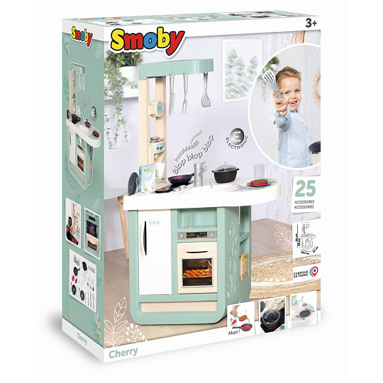 Kuchyňka Cherry v moderním designu se spoustou kuchyňských doplňků obsahuje 25 příslušenství. Kompaktní a realistická dětská kuchyňka, která je celá navržena v moderním designu současných kuchyní. Díky krásnému zbarvení v jemných pastelových tónech se hodí do dětského pokoje i do společného obývacího pokoje. Kuchyně Cherry má sporák se dvěma plotýnkami, troubu a digestoř. Elektronický zvukový modul v jedné z plotýnek zajišťuje realistické zvuky vaření. Kuchyňka na hraní má také lednici, dřez s kohoutkem a espresso kávovar s různými kapslemi na čaj a kávu. Maso a ryby mají dvě různé strany, syrové a smažené. Rozsáhlé příslušenství lze snadno uložit do jedné z mnoha polic. Hrací plocha je rozšířena o malý stolek. Součástí vybavení je rendlík s poklicí, talíř, příbory, nádobí, makety obalů od jídla, hrnek, hrneček a pánev. Výška pracovní plochy: 48,5 cm. Rozměry produktu (DxŠxV): 66,5 x 32 x 95,7 cm.