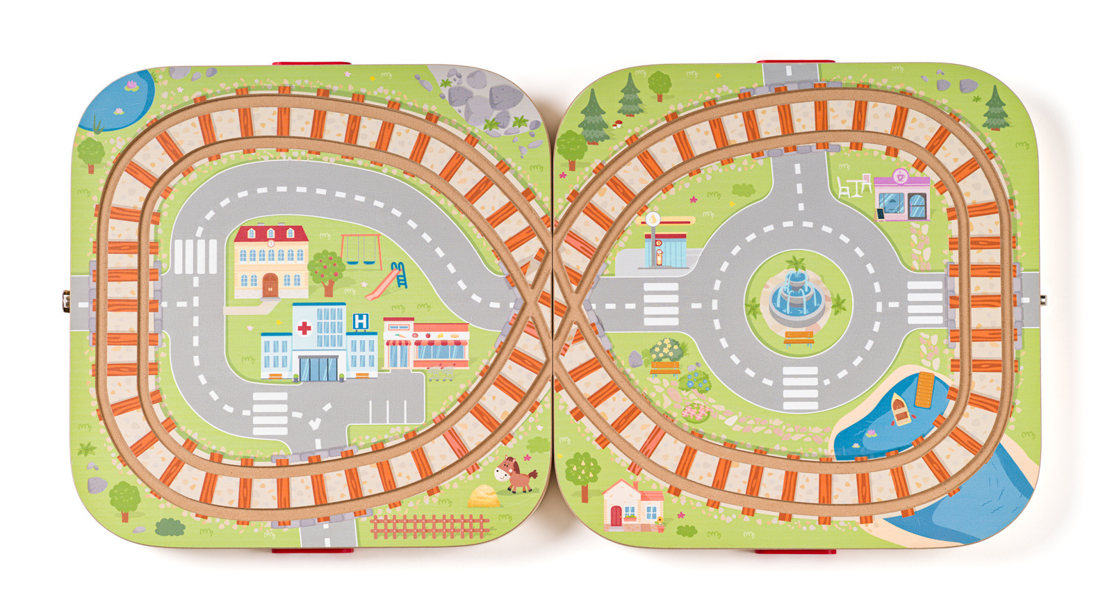 Woody Kufřík s městem a vláčkodráhou
