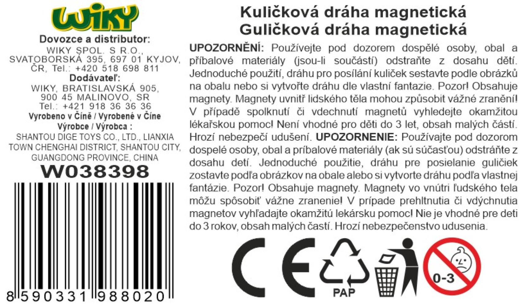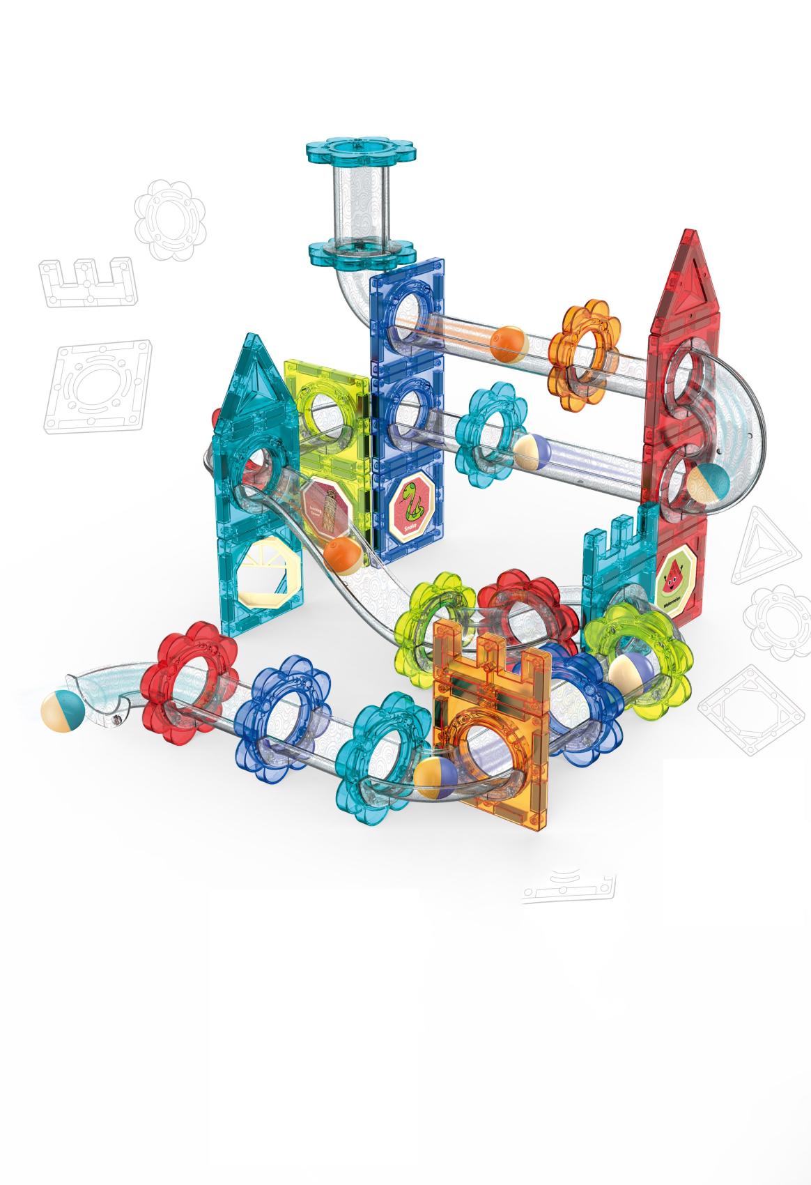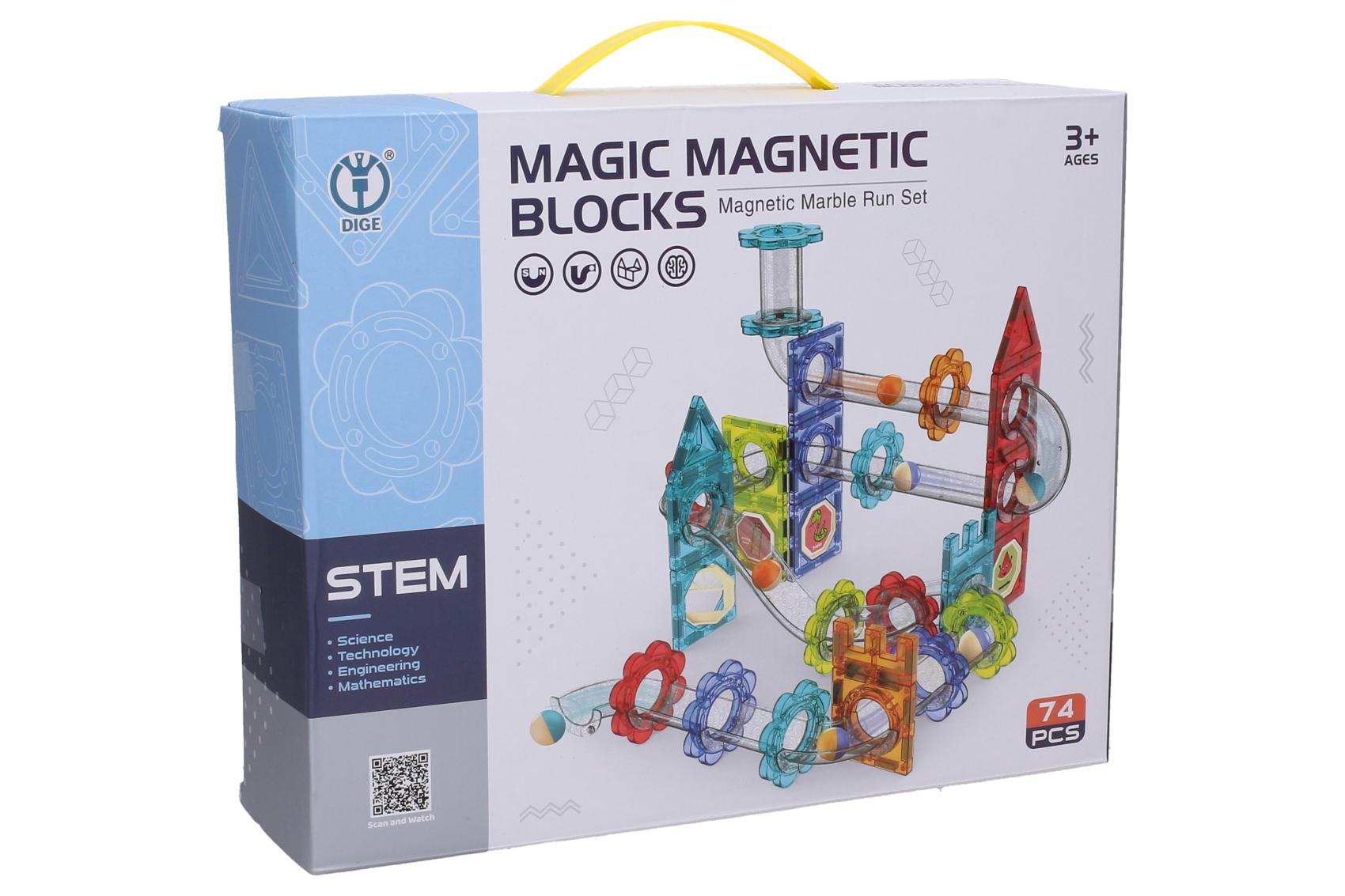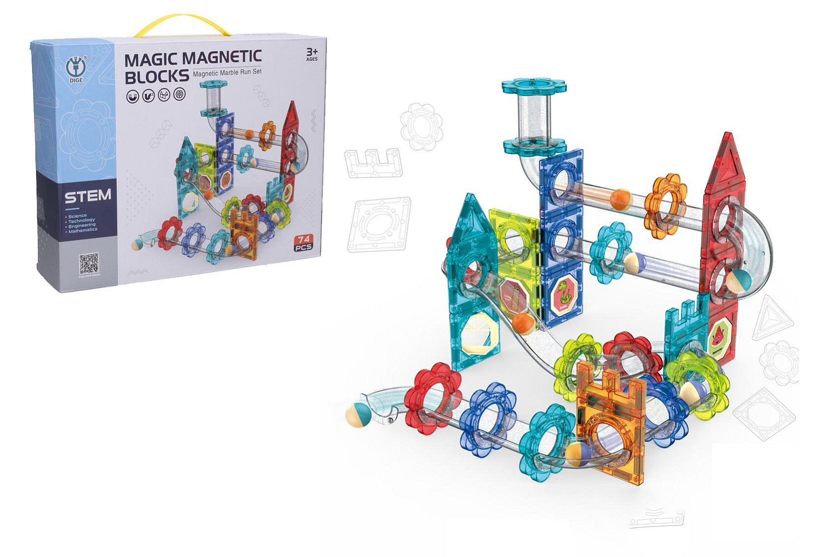 Kuličková dráha magnetická set. Balení obsahuje 74 ks. Obsahuje magnetickou stavebnici s tunely na tvorbu kuličkové dráhy, nálepky, návod, kuličky.