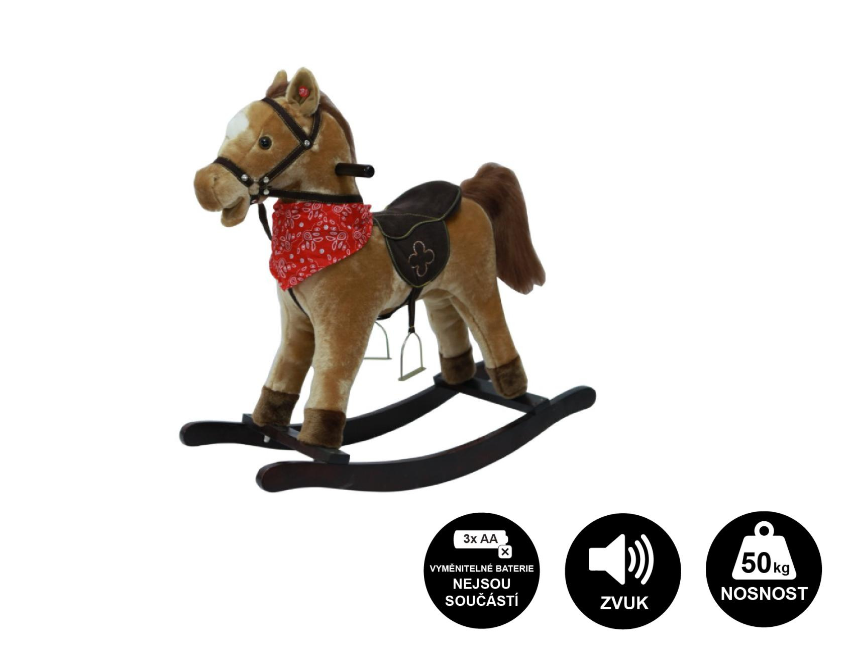 Kůň houpací hnědý plyš na baterie 71cm se zvukem a pohybem nosnost 50kg v krabici 62x56x19cm
