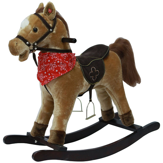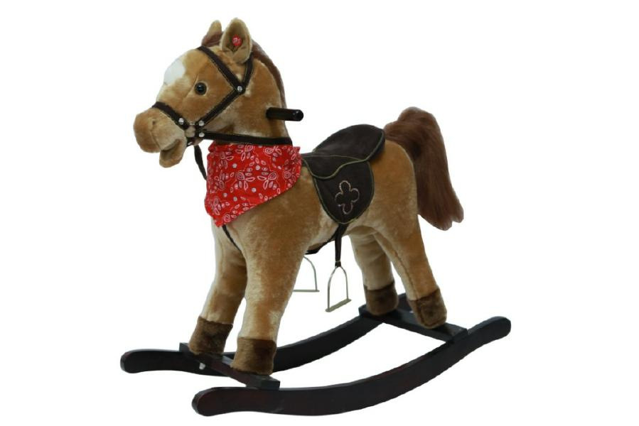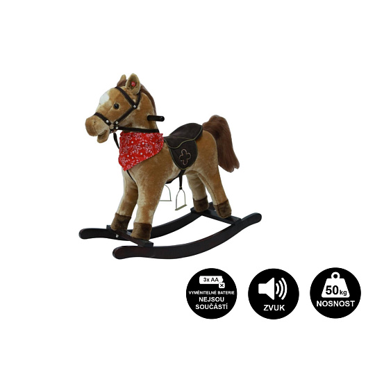 Heboučký houpací kůň po zmáčknutí ouška řehtá a hýbe ocáskem. Po zmáčknutí druhého ouška vydává zvuky klapotu podkov při klusu a hýbe ocáskem. Baterie se vkládají do pouzdra umístěného na bříšku. Hračka pomáhá dítěti rozvíjet koordinaci pohybů a podněcuje jeho představivost. Návod na sestavení a vložení baterií je uvnitř krabice. 3ks baterií AA nejsou součástí balení. Nosnost 50 kg. Výška koně: 71 cm Výška sedla: 47 cm Rozměr balení 62 x 56 x 19 cm Vhodné pro děti od 3 let