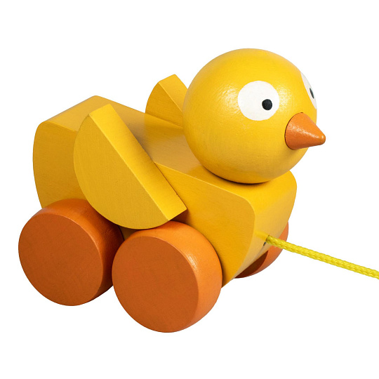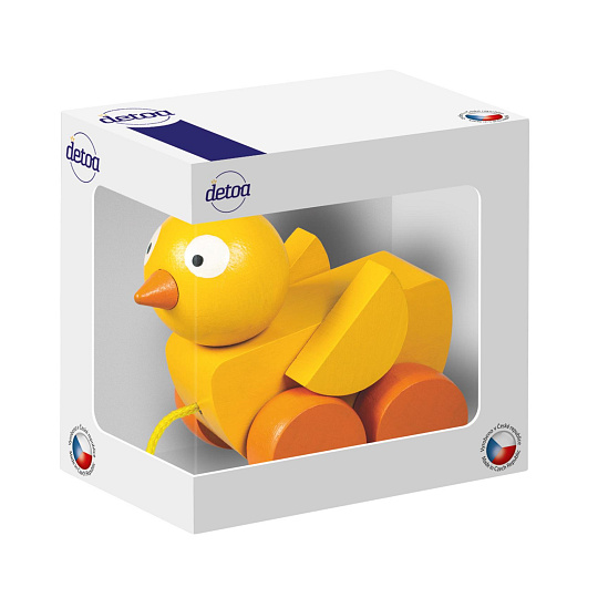 Tahací hračka kuře. Kuře doprovází děti při jejich prvních krůčcích. Rozměry výrobku jsou 95x64x85 mm. Baleno v papírové krabičce. Varování: nevhodné pro děti mladší 12 měsíců. Dlouhá šňůra. Nebezpečí uškrcení