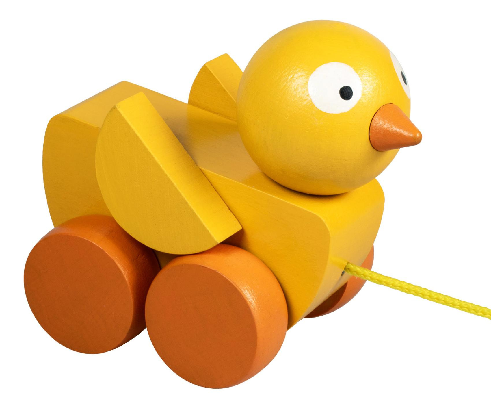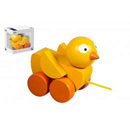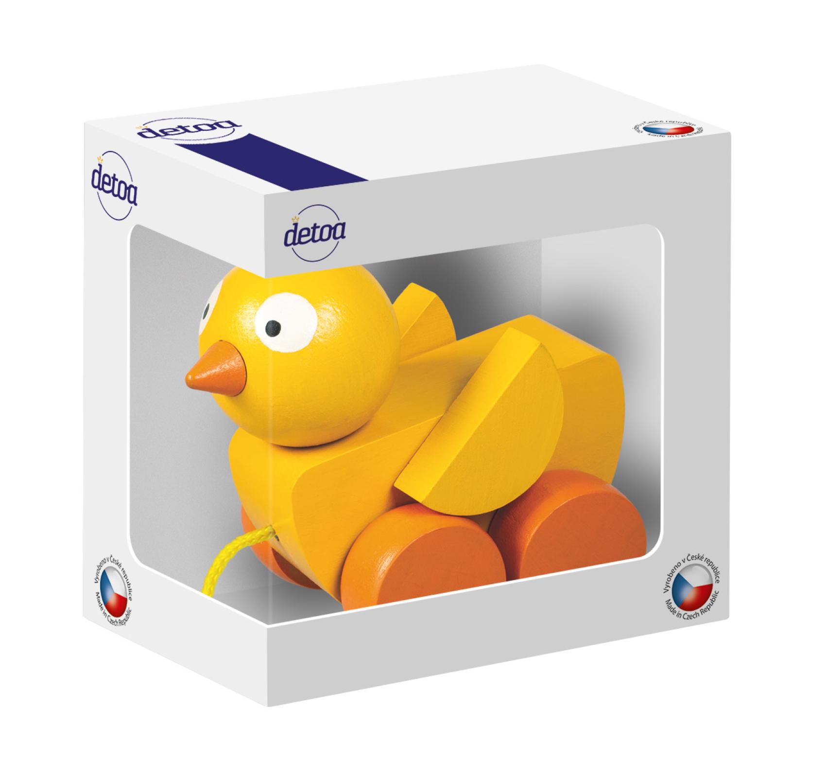 Tahací hračka kuře. Kuře doprovází děti při jejich prvních krůčcích. Rozměry výrobku jsou 95x64x85 mm. Baleno v papírové krabičce. Varování: nevhodné pro děti mladší 12 měsíců. Dlouhá šňůra. Nebezpečí uškrcení