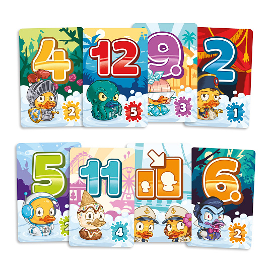 Každý hráč si vybere 1 ze 7 kachních rodin, zamíchá 12 karet a náhodně je vyloží do mřížky 4x3.
