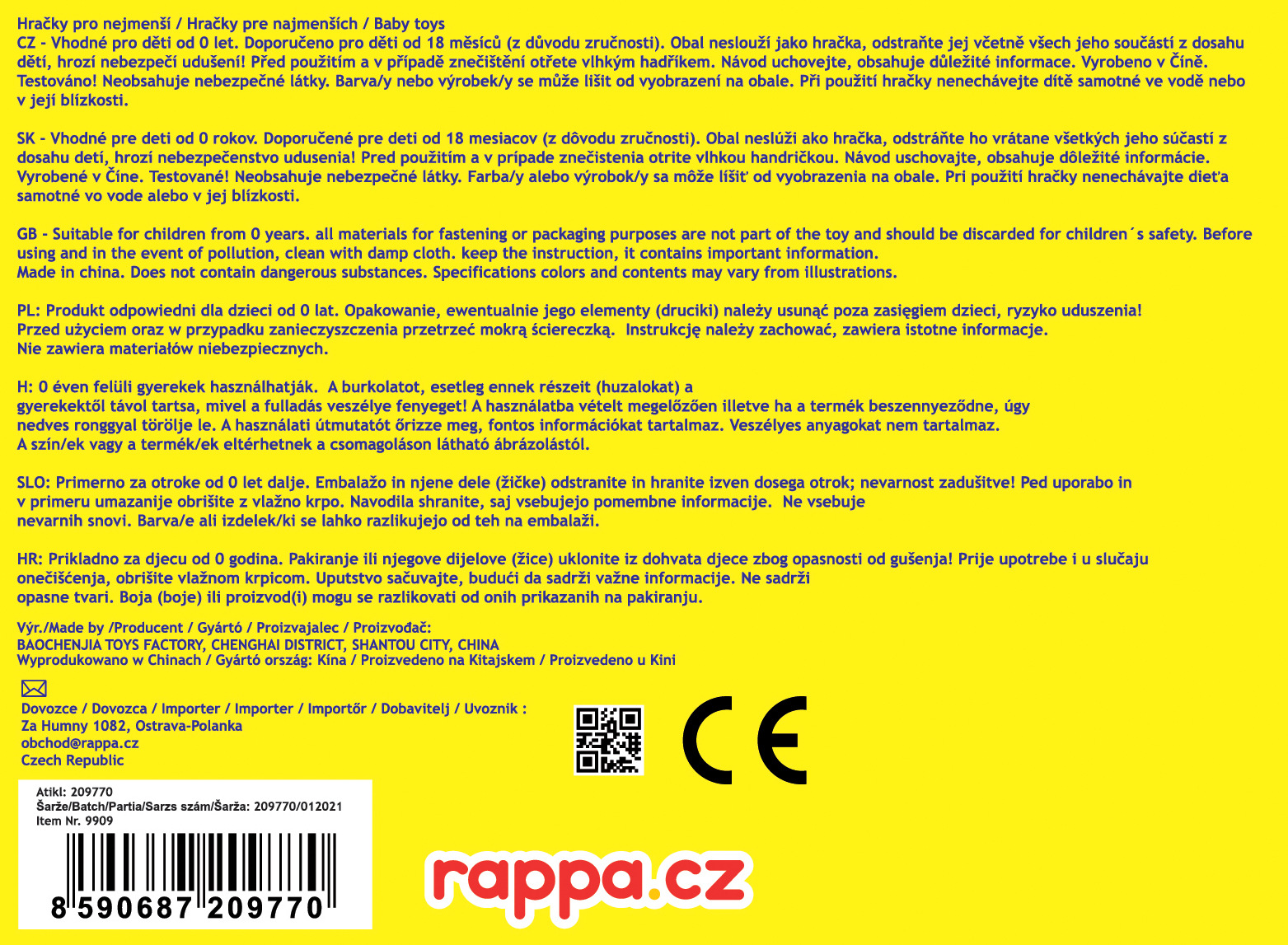 Knížka do vody pro nejmenší s pískacím přívěskem. Má 8 stran s obrázky mořských zvířátek. Rozměr zavřené knížky: 13x13cm.