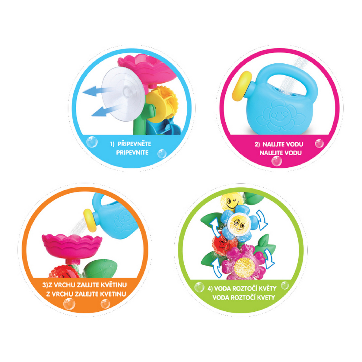 Květina do vany s konvičkou pro ještě větší zábavu při koupání. Nalejte vodu do horního květu a nechte ji volně protékat dolů a sledujte, jak se květinky roztočí! Součástí je konvička, která přesně padne do malé ručičky vašeho děťátka. Tato hračka navíc rozvíjí smyslové vnímání dítěte a podněcuje jeho fantazii. Různé barevné kombinace.