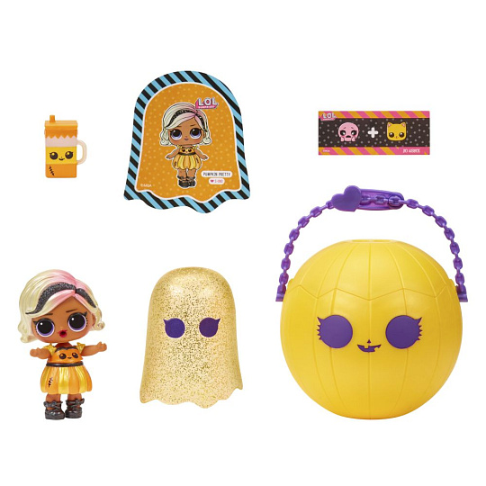 2 panenky z limitované edice připravené na strašidelnou party. Můžeš je převléknout za duchy! Dej panence napít, jedna bude plakat a druhá čůrat. Obal ve tvaru halloweenské dýně slouží také jako stojánek pro panenku.