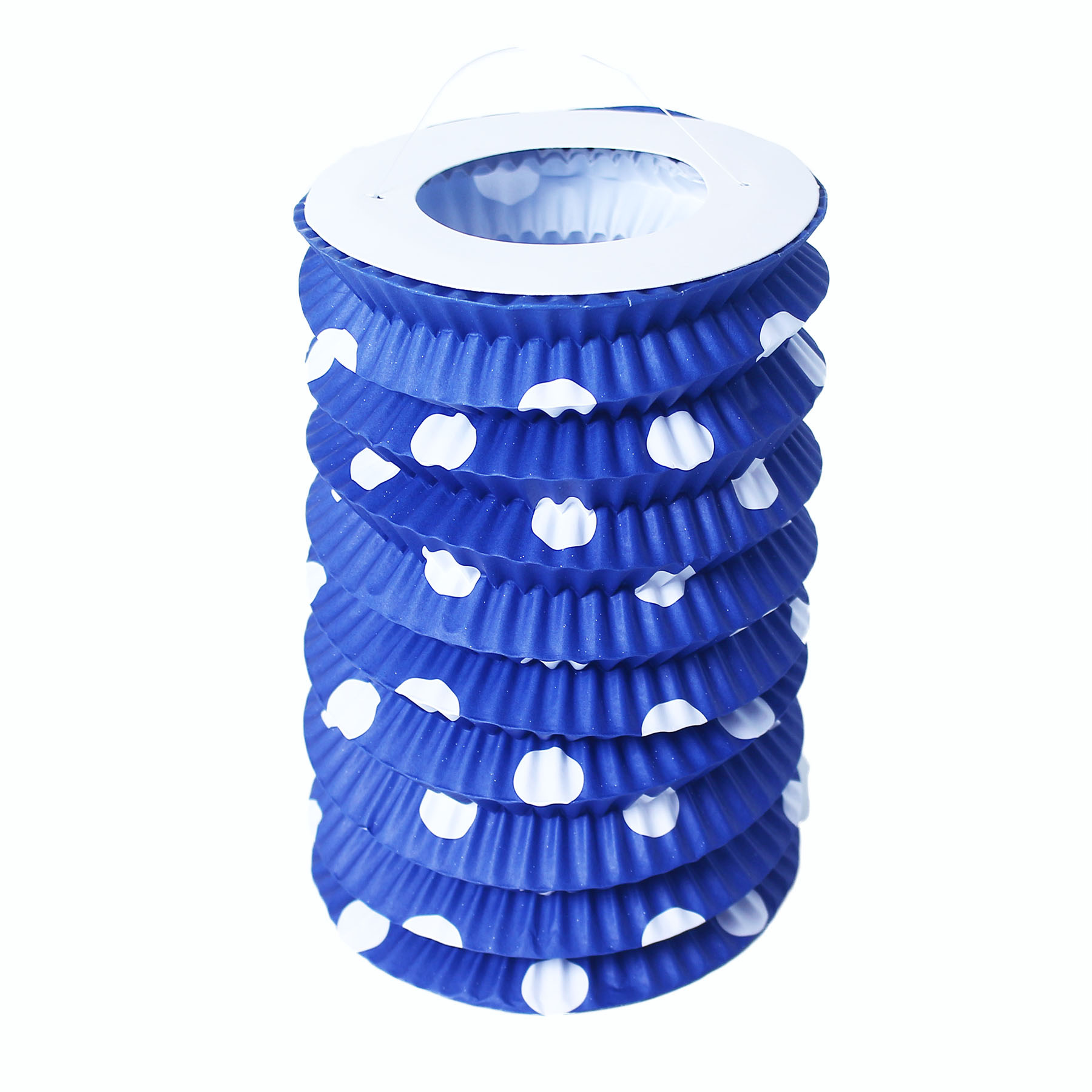 Modrý lampion s bílými puntíky je vyroben z papíru. Tento super kousek ti zaručí parádní atmosféru na tvém večírku nebo oslavě! Lampion nemá žádnou úchytku na svíčku.