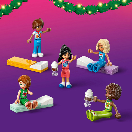 Vneste si domů sváteční atmosféru se stavebnicí LEGO® Friends Adventní kalendář 2025 (42668) pro děti od 6 let. Malí stavitelé každý den otevřou jedno z okének, za kterými se skrývá celkem 5 mini panenek včetně Aliyi, Autumn, Liann, Novy a Lea a 5 figurek zvířátek LEGO včetně 2 psů, morčete, gekona a kočky. Každý den vás za jedním z okének čeká kousek příběhu o vánoční přespávačce. Objevte překvapení se sladkými vánočními modely a svátečními aktivity, jako je psaní dopisu Santovi, zdobení stromečku, zpívání karaoke, jízda na koníčkovi a příprava horké čokolády. Každá mini panenka má vlastní matraci a každé ze zvířátek vlastní doplňky, které děti při sestavování scény inspirují k řadě příběhů. Mezi další zábavné doplňky patří pohovka, lampa, krb, sáňky, 5 dárkových krabiček a plyšový sob LEGO. Tato kreativní stavebnice slouží nejen jako dárek k vánočnímu odpočítávání pro děti, ale také rozvíjí sociální dovednosti malých stavitelů, kteří se mohou připojit ke kamarádům a společně s nimi prožít nezapomenutelnou přespávačku.