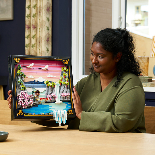 Inspirací pro tuto stavebnici se stalo tradiční japonské umění ukijo-e, které zachycuje krásu pomíjivosti a harmonii přírody. V modelu naleznete ikonické prvky japonské krajiny, jako je majestátní hora Fudži, tradiční čajovna, elegantní most, kaskádovitý vodopád a ladné létající jeřáby mandžuské. Nechybí ani symbol jara – rozkvetlé sakury, a unikátní javor „Sango-Kaku“ s korálově červenou kůrou, a elegantní japonské pajehličníky.