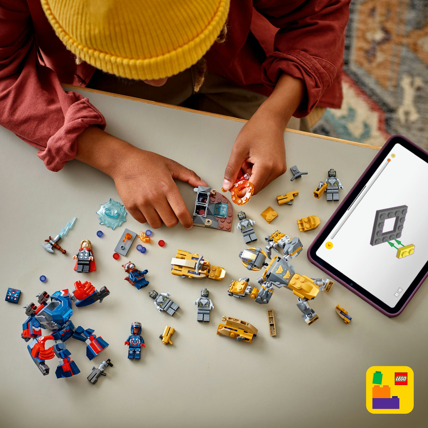 Minifigurky LEGO® | Marvel – Součástí je 7 minifigurek: Iron Patriot MK2, Rocket s velkým vystřelovačem, Thor se Stormbreakerem a 4 Chitauri, z nichž 2 mají zlaté vystřelovače