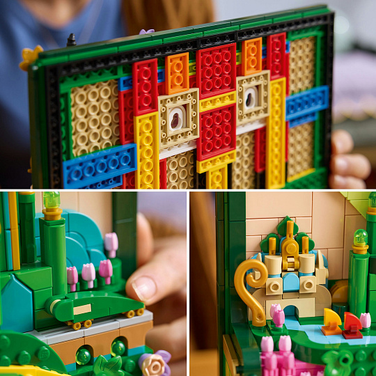 Tento umělecký dárek Wicked pro ženy, muže a dospělé fanoušky Wicked vdechne život filmovým momentům ve 3D podobě. V této pestrobarevné dekoraci najdete klíčová místa z filmu, včetně univerzity Shiz, Munchkinlandu a města Emerald City. Součástí je také Glindina bublina, kouzelný les a tajná schránka, která ukrývá 4 postavy – minifigurky LEGO Dorothy Gale, Cowardly Liona, Scarecrowa a Tin Mana a řada dalších skrytých odkazů na film, které čekají, až je objevíte.