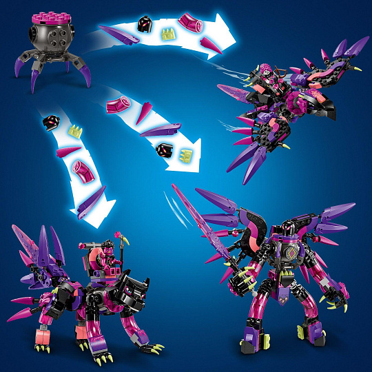 Popusťte uzdu své fantazii s kouzelnou stavebnicí LEGO® DREAMZzz™ (71483) Nikdyčarodějnice a její stvoření z noční můry pro děti od 9 let. Tato přestavitelná fantasy stavebnice je inspirovaná napínavým televizním seriálem a umožní klukům a holkám seznámit se se zlými stvořeními Nikdyčarodějnice. Krkavec Nikdyčarodějnice se dostal dovnitř a ukradl Mateovi vzpomínku. Nikdyčarodějnice s kotlem z nočních můr použije vzpomínku k vytvoření jeho zlého dvojníka, MadTea. Ale co vytvoří příště? O tom rozhodnou děti! Malí snílci popustí uzdu kreativitě a postaví model krkavce, který pak přestaví na vlka nebo na figurku DoomBloba, zlého dvojníka Z-Fleka. Této stavebnici LEGO DREAMZzz vdechuje život 5 minifigurek: Mateo, MadTeo, Doey, Dogan a Nikdyčarodějnice, které inspirují k nekonečnému hraní. Součástí je také návod na stavění vedený příběhem, který děti inspiruje k tomu, aby se ponořily do dobrodružství a ztvárnily své nejdivočejší sny. Rozměry – Model se skládá z 457 dílků a měří přes 12 cm na výšku, 28 cm na šířku a 25 cm do hloubky
