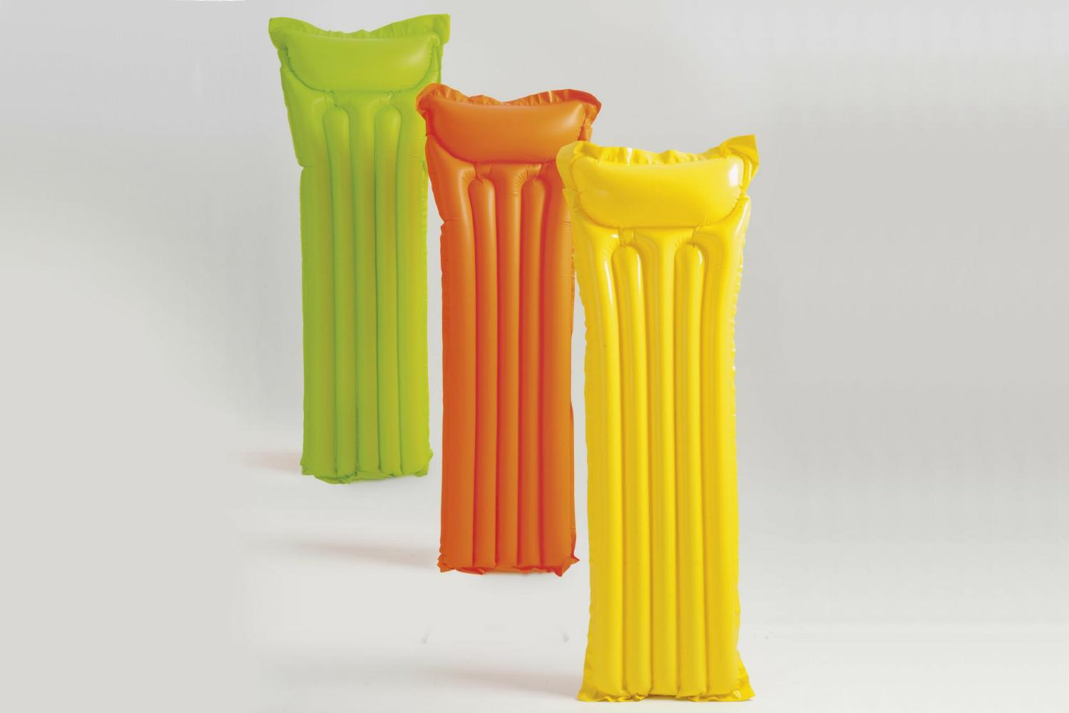 Nafukovací lehátko o rozměrech 183 x 69 cm, v zářivých barvách a s integrovaným polštářem. 2 vzduchové komory a vinyl o tloušťce 0,20 mm zajišťují pevnost a příjemný komfort při ležení. V nabídce ve 3 různých barvách. Maximální zatížení: 80 kg.