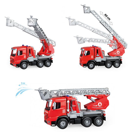 Požární stříkačka s dostřikem až 3m. 250ml izásoba vody. nádobka na zásobu vody. Otočný žebřík. Výsuv žebříku 60cm