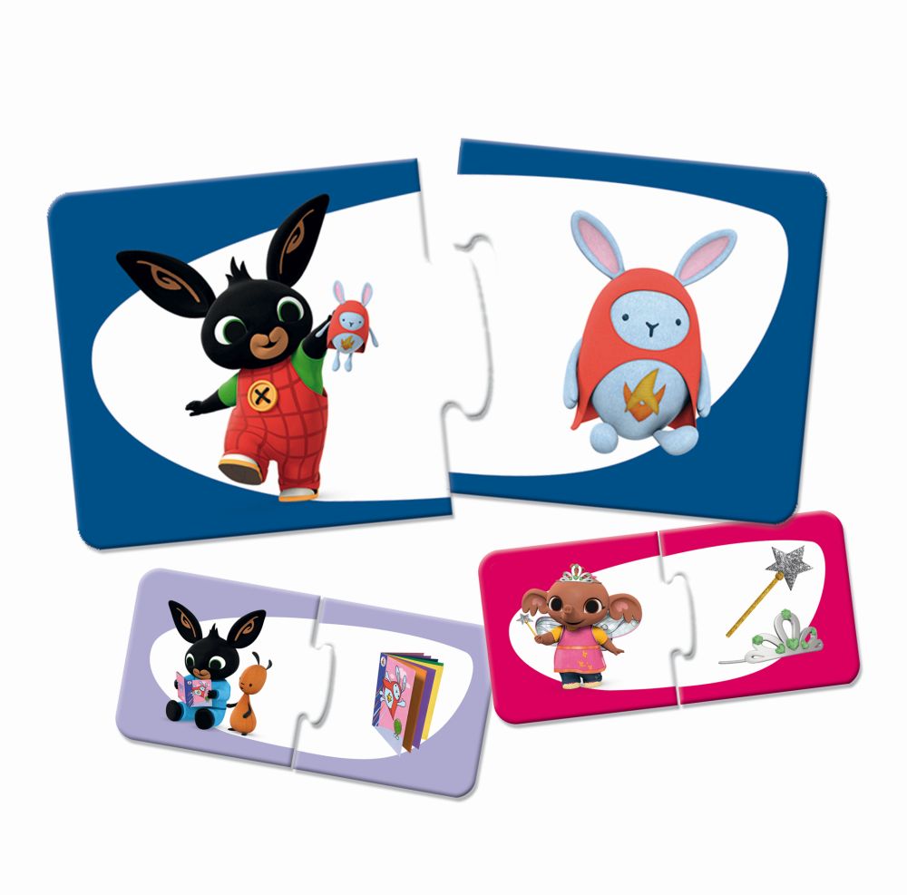 Sada jednoduchých dvojdílných skládaček s obrázky králíčka Binga a jeho přátel je určena pro děti, které s puzzle začínají. Velké a pevné dílky usnadňují dětem skládání. Doporučený věk od 1 roku.
