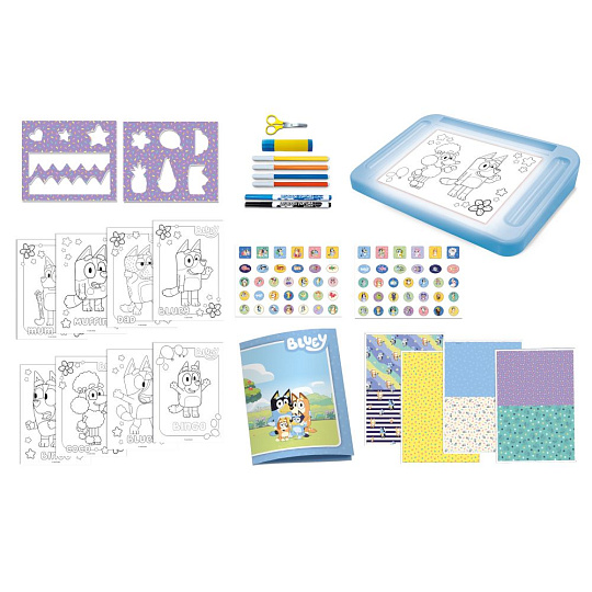 Originální kreativní sada, která vám pomůže stát se skutečným umělcem! S světelným stolem o velikosti A4 se můžete naučit kreslit postavičky a obrázky Blueyho. V balení najdete také šablony, samolepky, vonné fixy a barvy pro zdobení vašich výtvorů a personalizaci světelného stolu.