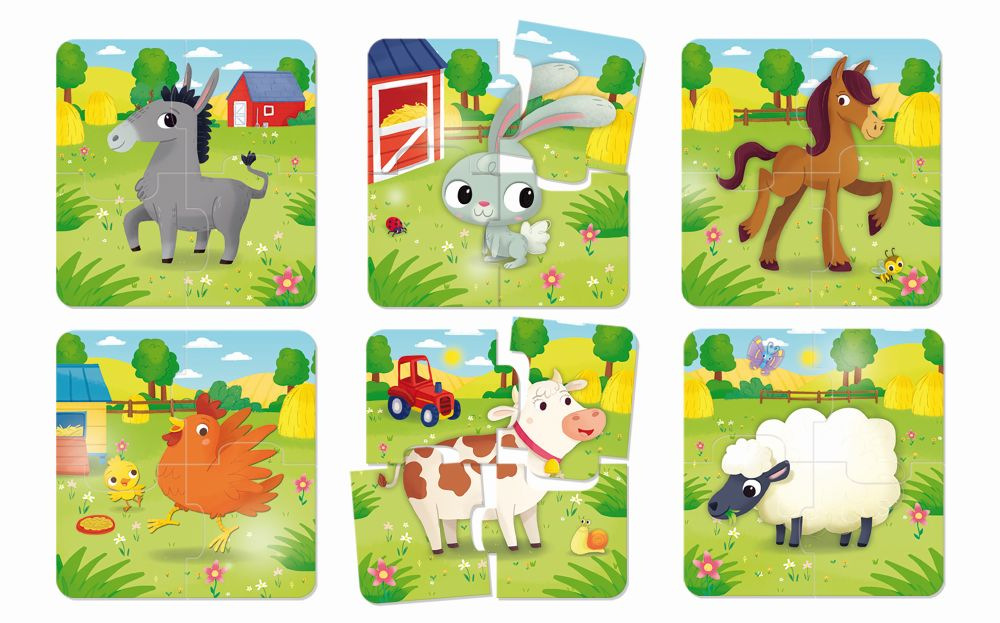 Spousta zábavných hlavolamů s přáteli z farmy. Rozvíjejte pozorovací schopnosti a poskládejte obrázky z dílků správně. Sada obsahuje 24 dílků z kterých složíte 6 obrázků. Vyrobeno z bezpečných materiálů vhodné pro děti od 1 roku.\nCarotina je značka společnosti Lisciani a představuje její vzdělávací jádro. Značka je především zaměřena na předškoláky a kojence.