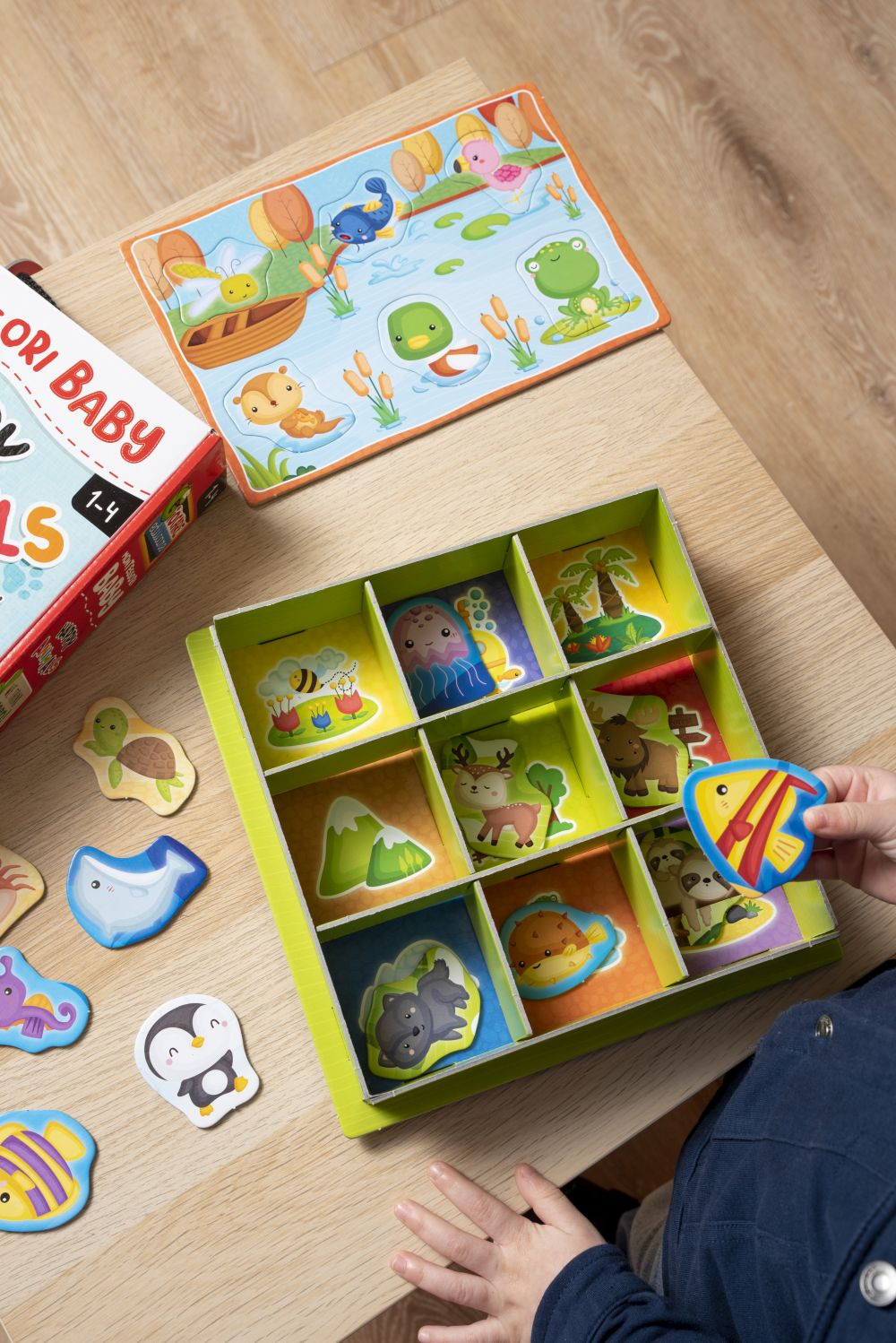 Barevná krabička věnovaná světu zvířat a jejich životnímu prostředí. Zařazovací hra založená na metodě Montessori. Tento druh Montessori her pomáhá dětem učit se zábavným a efektivním způsobem s využitím všech jejich smyslů. Vhodné pro děti od 1 roku. Set obsahuje 67 kusů.