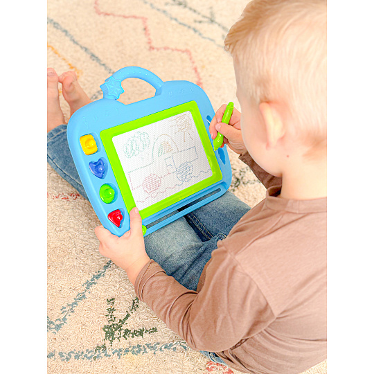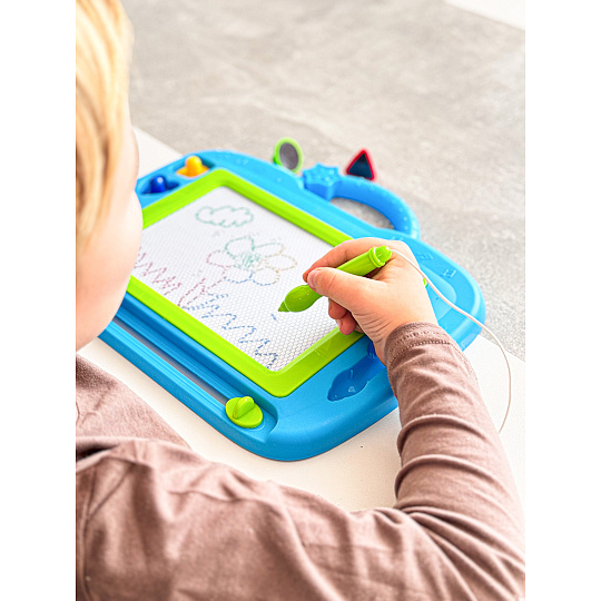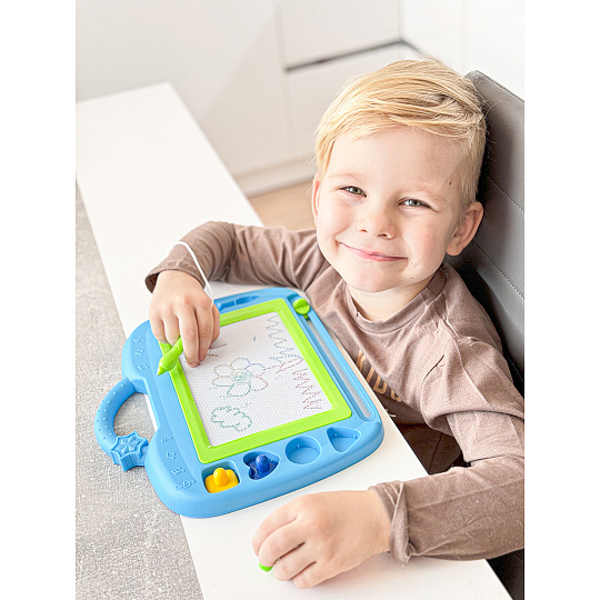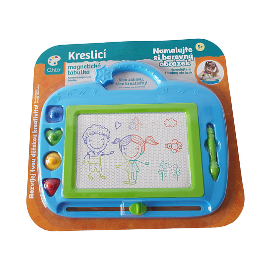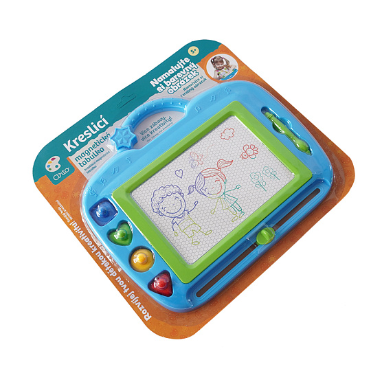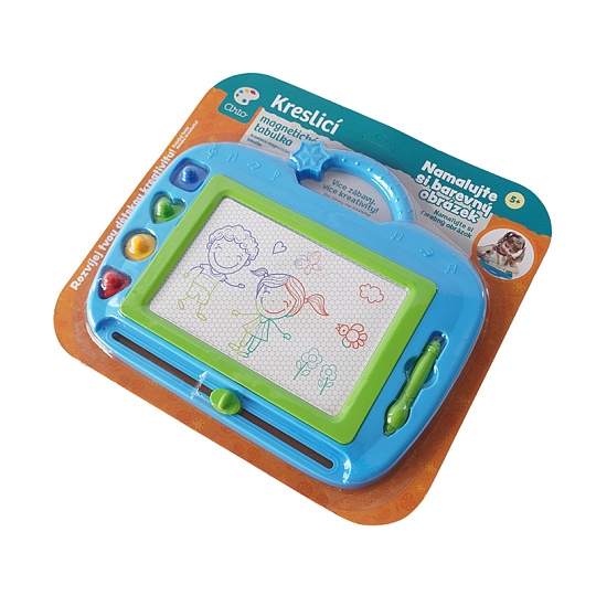 Na magnetickou tabulku kreslíš přiloženým perem. Můžeš použít i přiložená tiskátka. Jedním tahem lze obrázek smazat a můžeš začít znovu malovat.