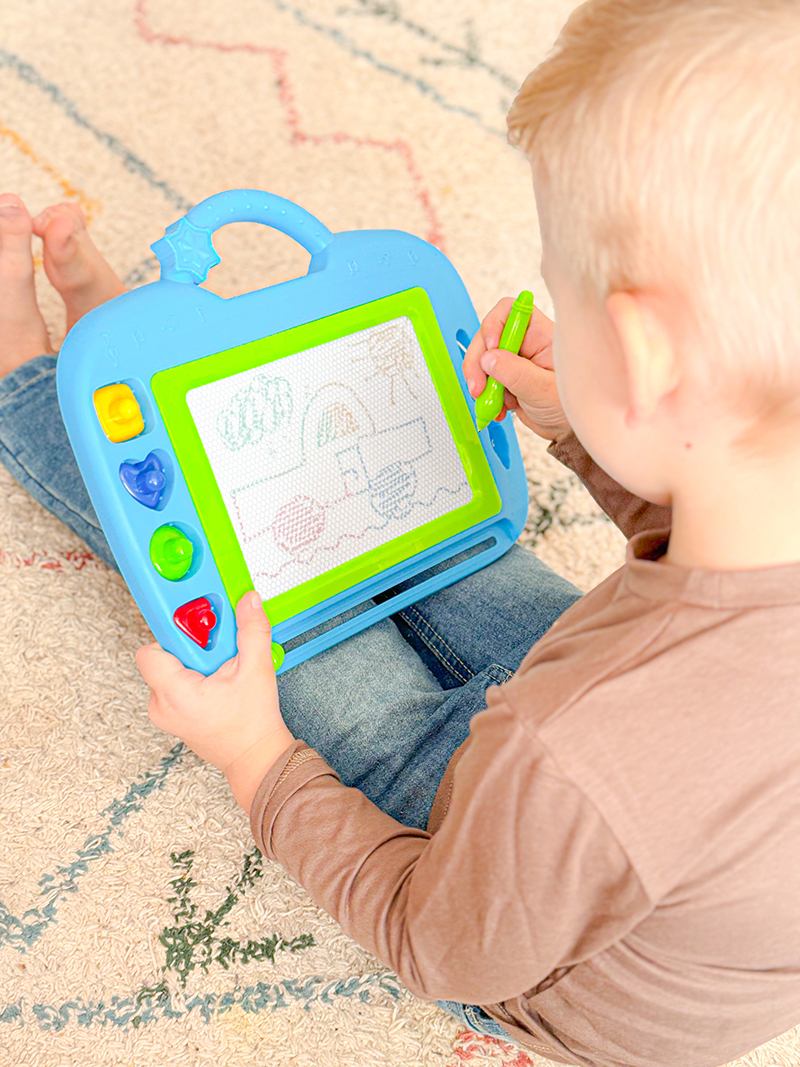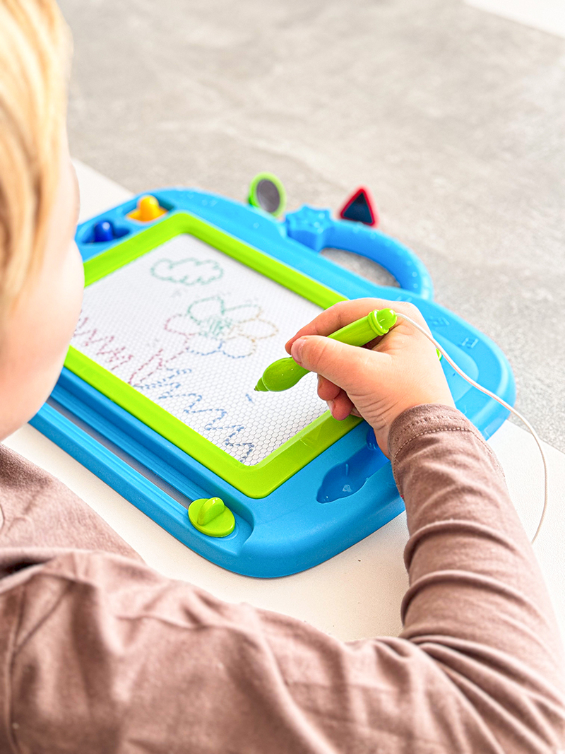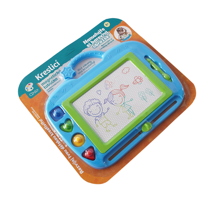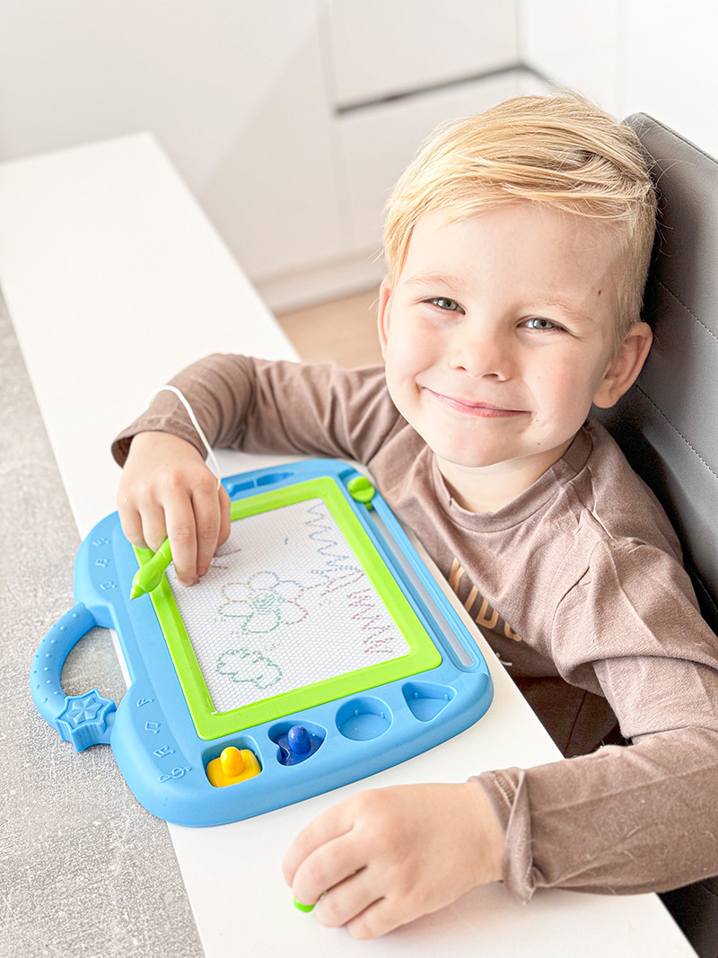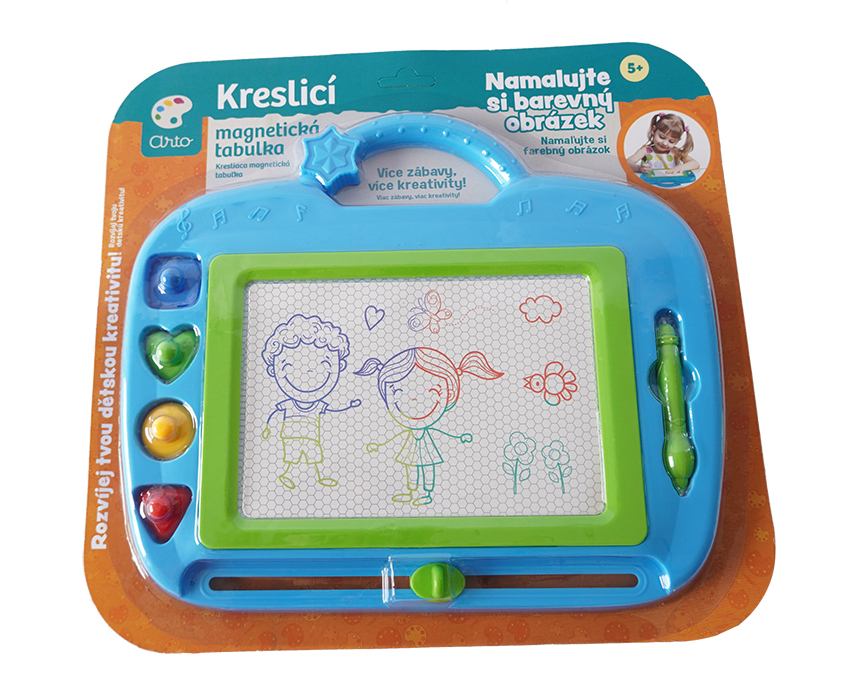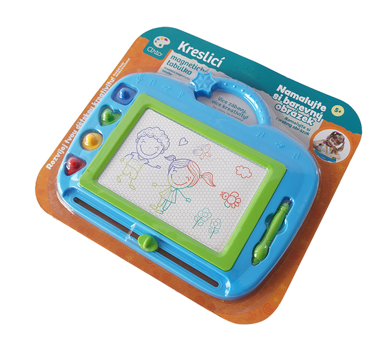 Na magnetickou tabulku kreslíš přiloženým perem. Můžeš použít i přiložená tiskátka. Jedním tahem lze obrázek smazat a můžeš začít znovu malovat.