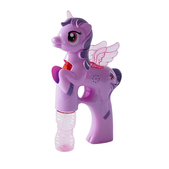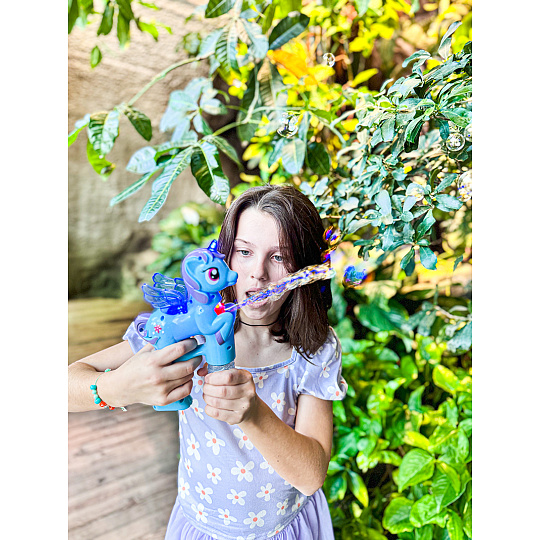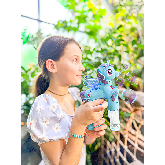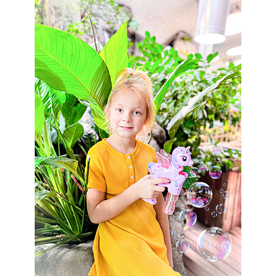 Bublifuk na baterie s jednorožcem. Pouhým zmáčknutím spouště děti vytvoří záplavu bublin. Při tvorbě bublin jednorožec hraje.