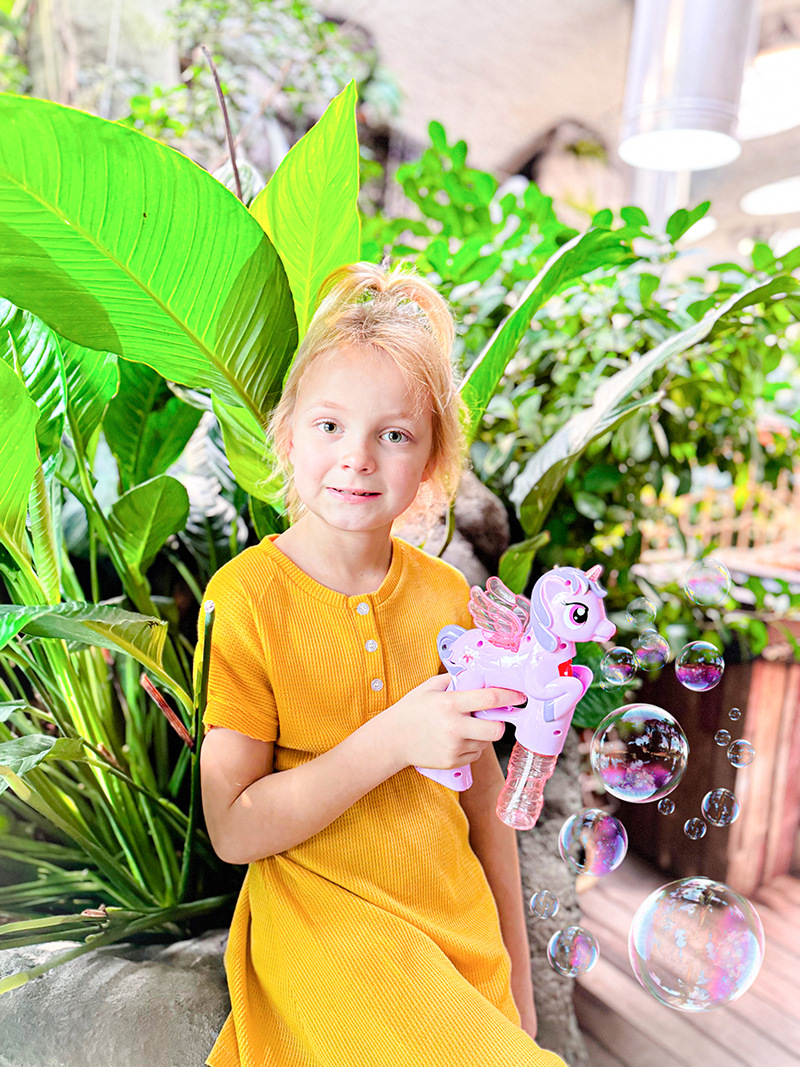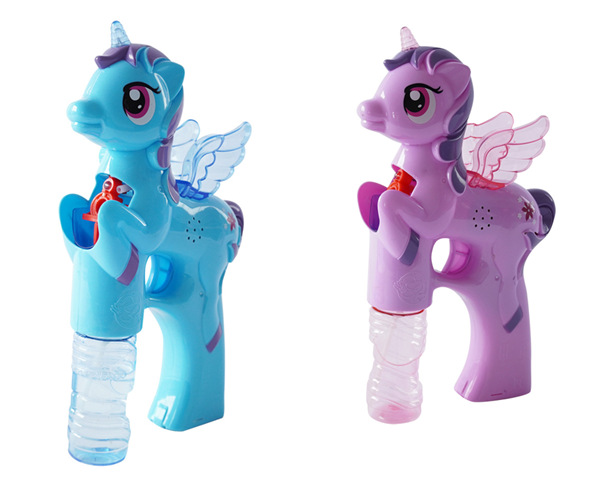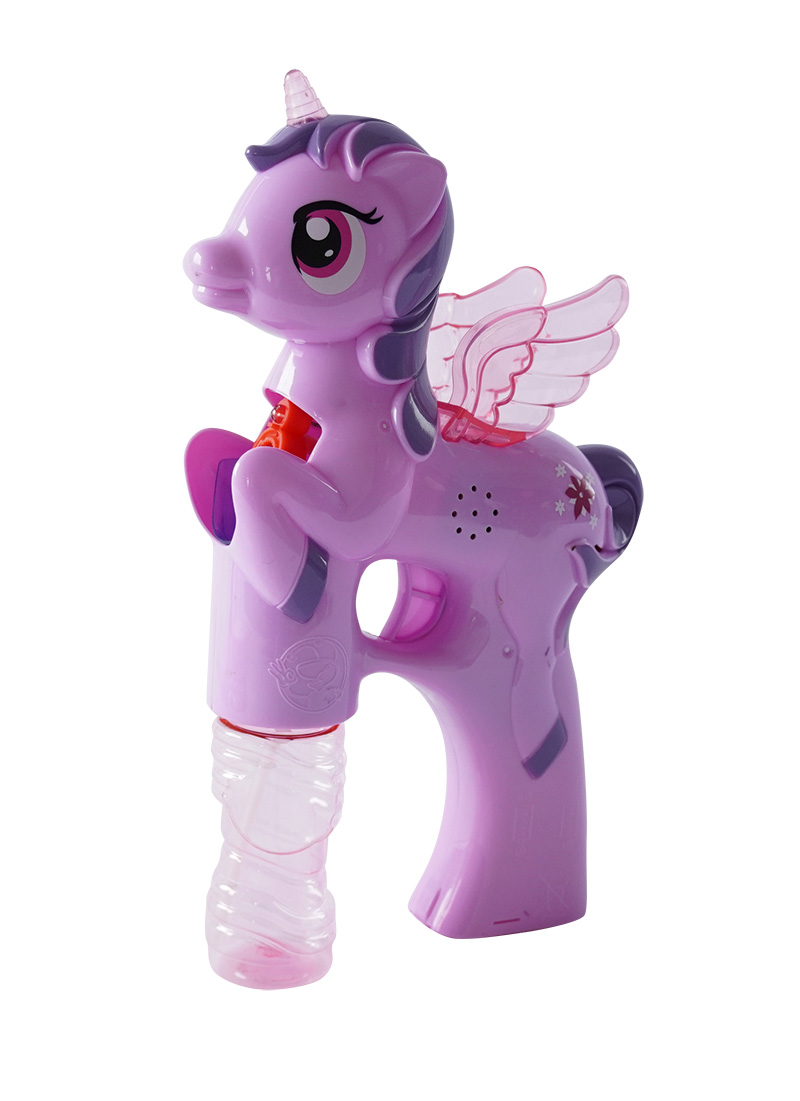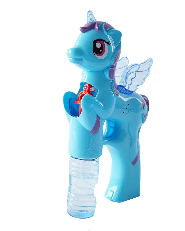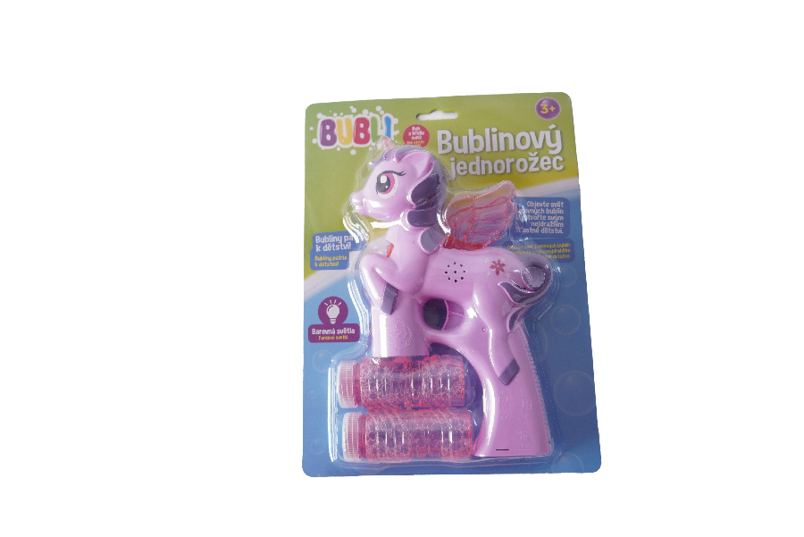 Bublifuk na baterie s jednorožcem. Pouhým zmáčknutím spouště děti vytvoří záplavu bublin. Při tvorbě bublin jednorožec hraje.