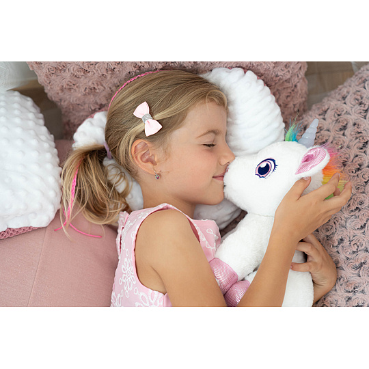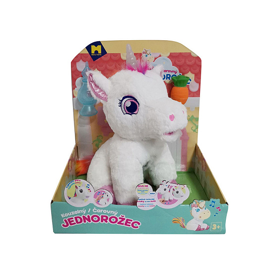 Interaktivní jednorožec, který vydává roztomilé zvuky, při pohlazení po zádech chrlí páru z pusinky a spokojene vrní a svítí mu roh různými barvami, které se mění.