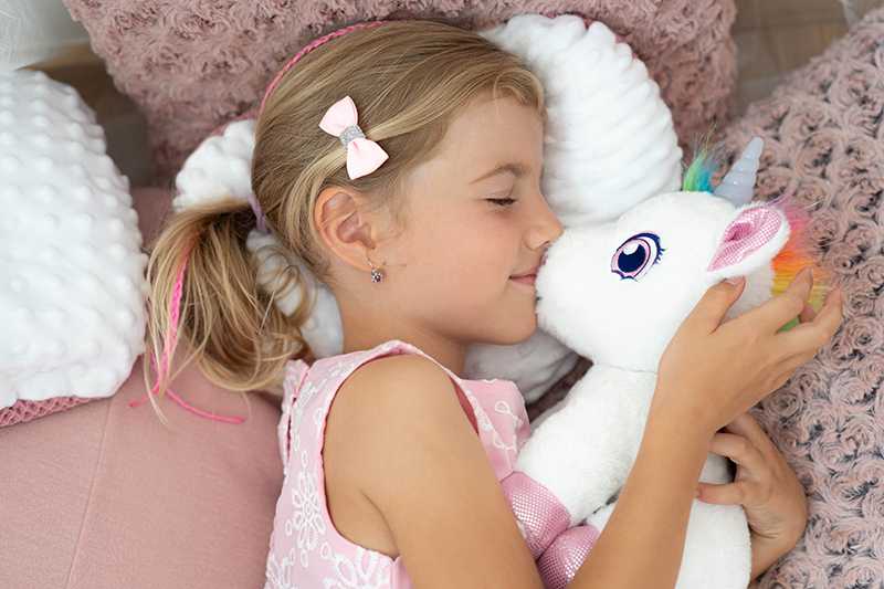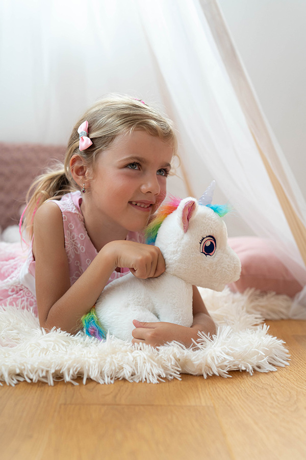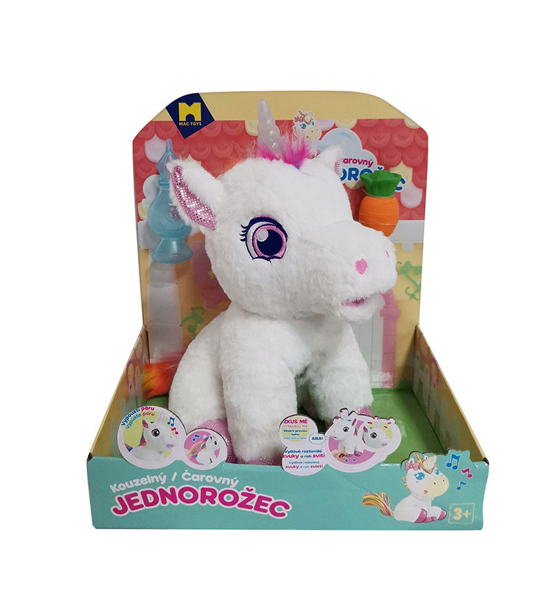 Interaktivní jednorožec, který vydává roztomilé zvuky, při pohlazení po zádech chrlí páru z pusinky a spokojene vrní a svítí mu roh různými barvami, které se mění.